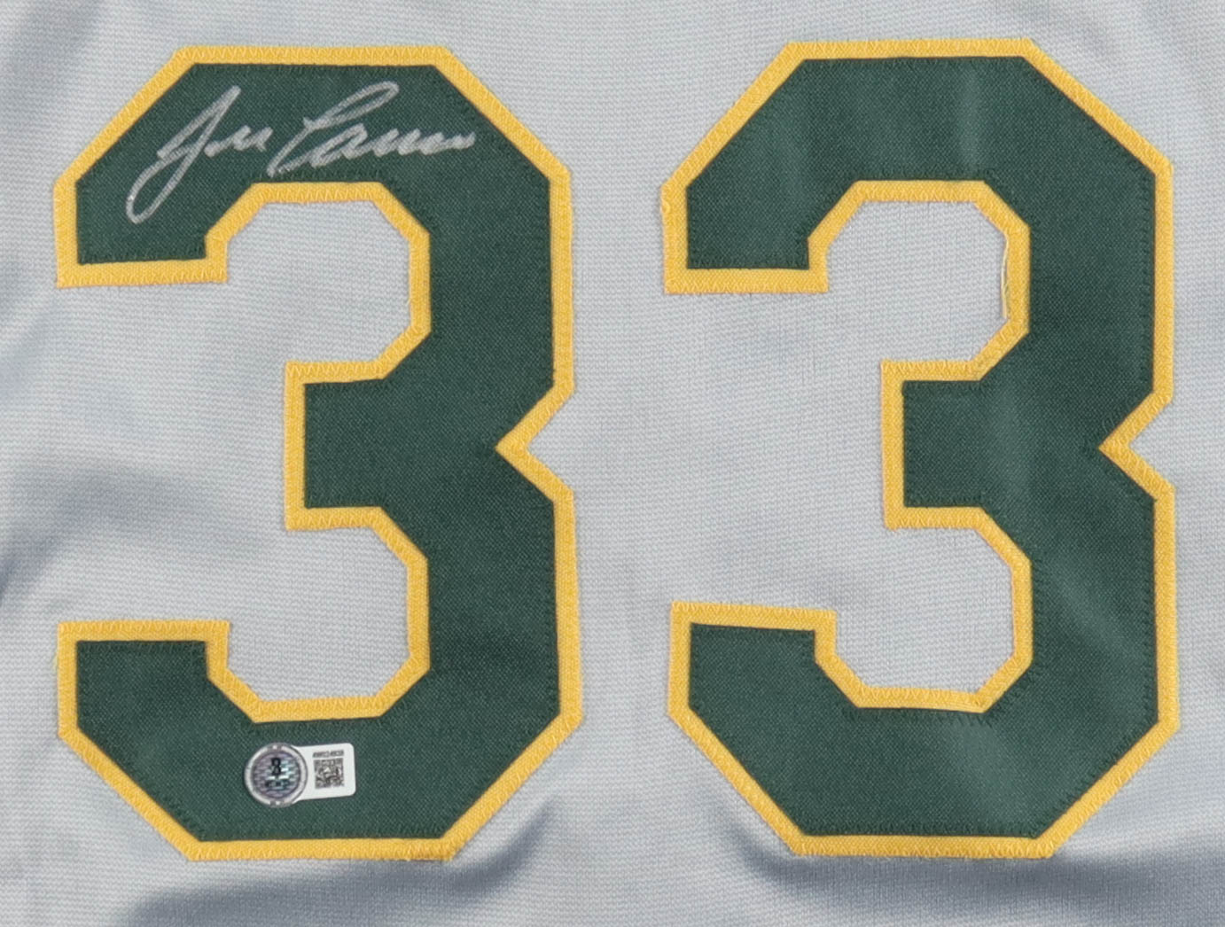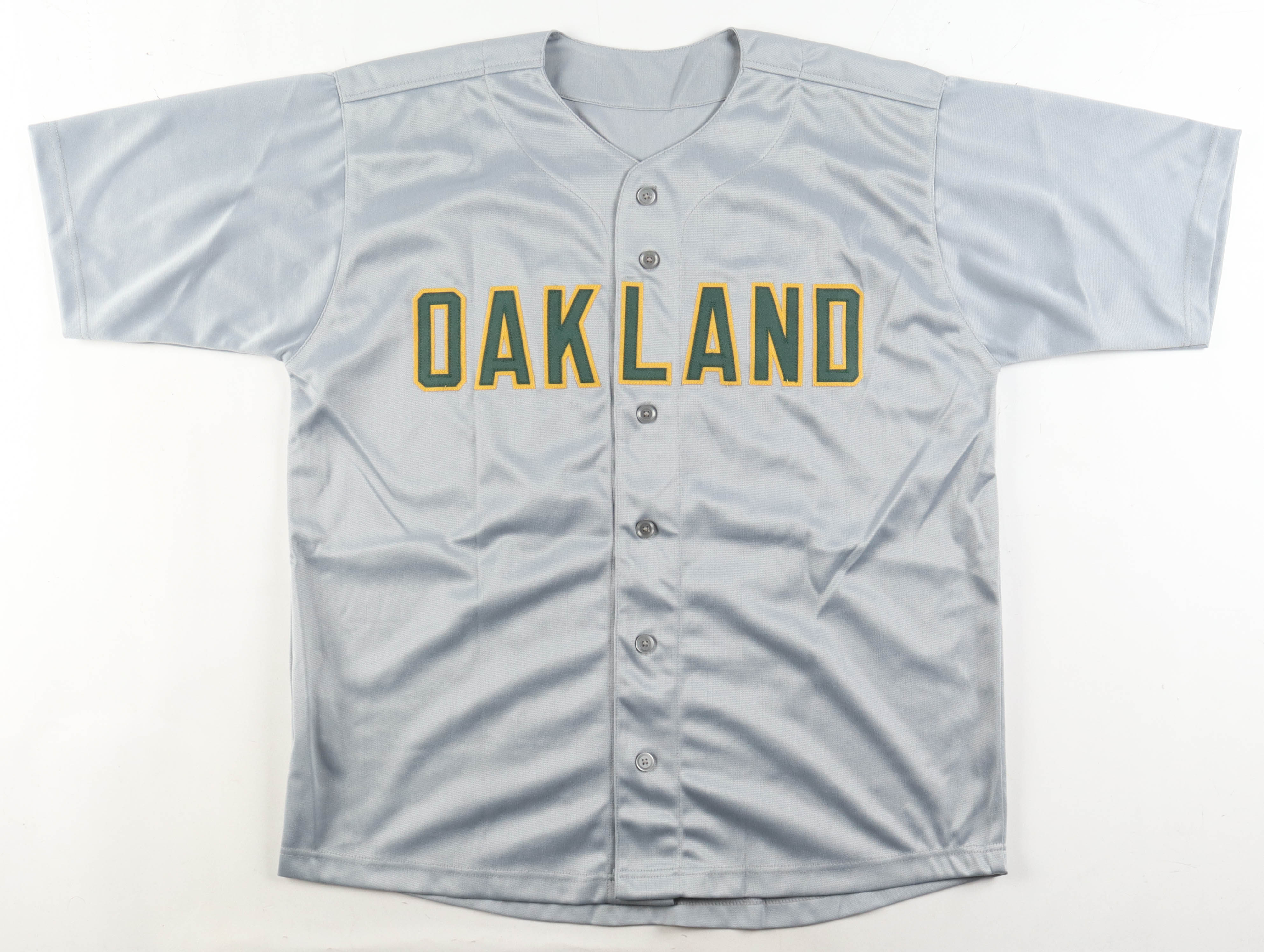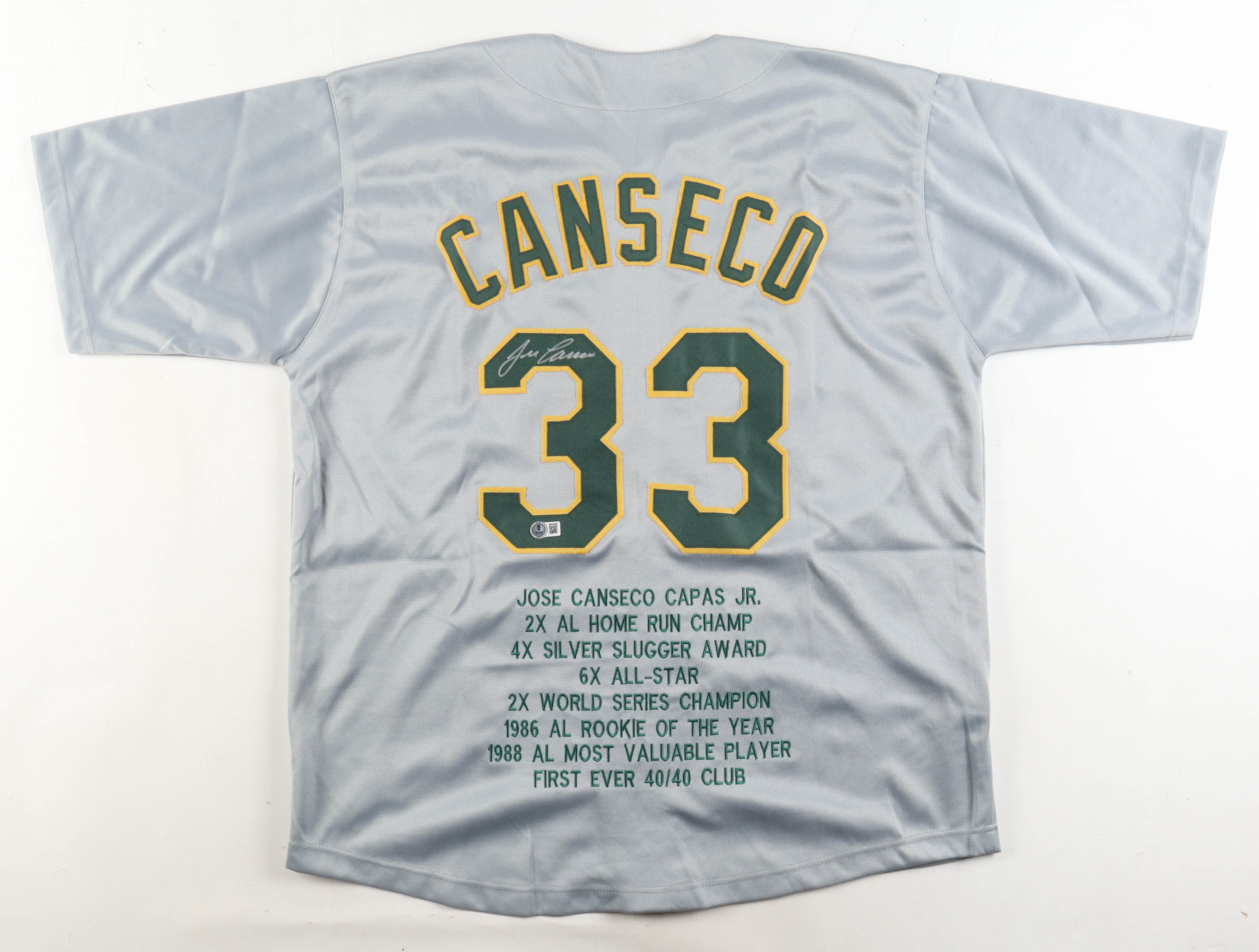 Custom jersey with everything sewn on, size XL. Hand-signed by Jose Canseco (HOF). Canseco's career highlights have been stitched onto the back of the jersey below the reverse numbers.