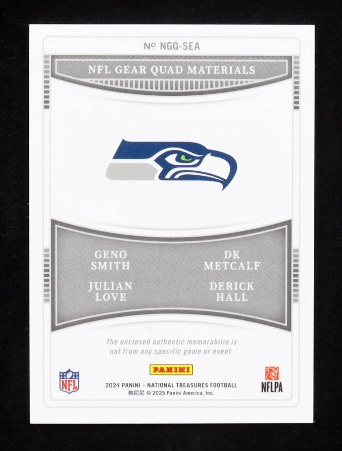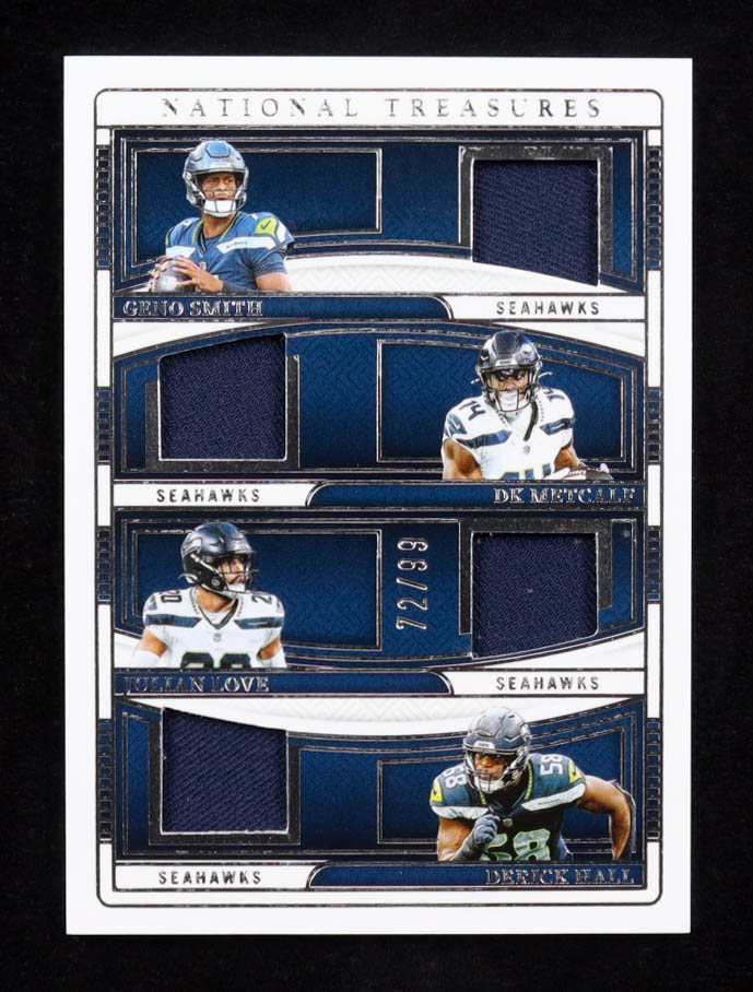 Geno Smith / DK Metcalf / Julian Love / Derrick Hall National Treasures NFL Gear Quad Materials #NGQ-SEA #72/79