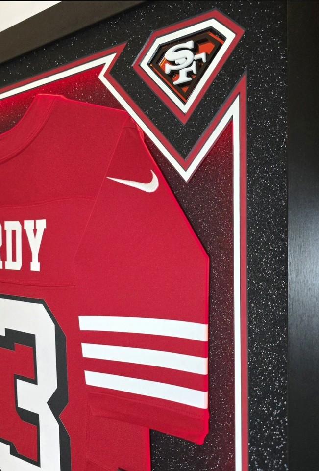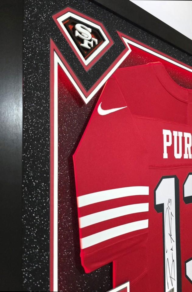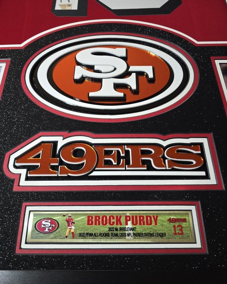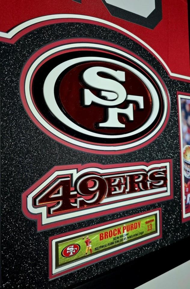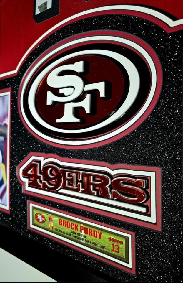 Custom frame measures 33" x 43" in size and comes installed with customizable LED backlighting. The frame features a Nike FUSE Limited jersey that has been hand-signed by Brock Purdy (San Francisco 49ers).