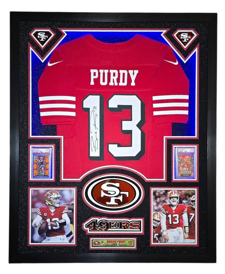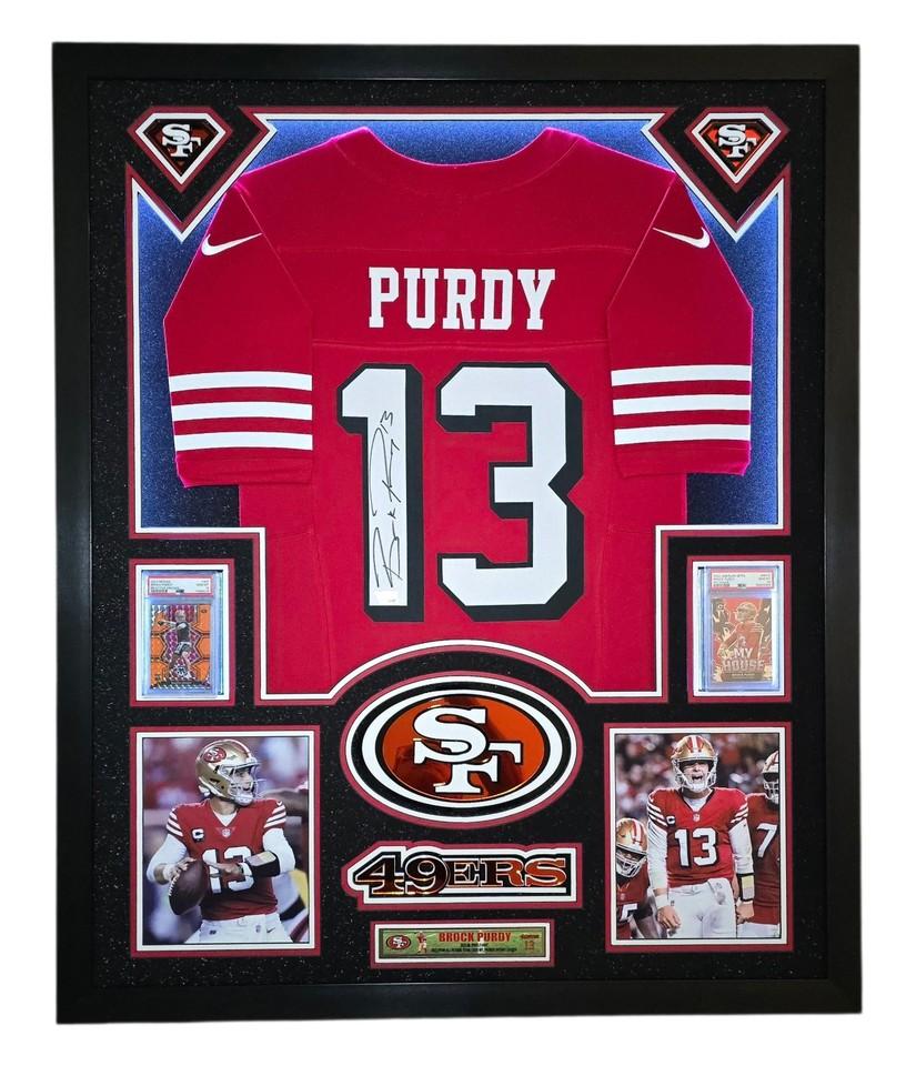 Brock Purdy Signed 49ers Custom Framed LED Backlit Nike Jersey Display & (2) PSA 10 Graded Rookie Cards (Fanatics)