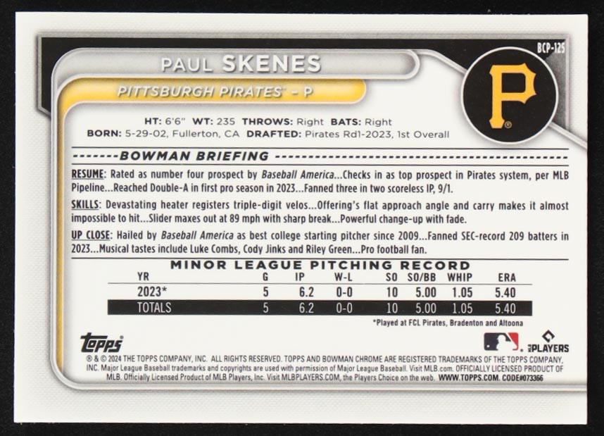 Paul Skenes 2024 Bowman Chrome Mega Box Prospects #BCP125 RC