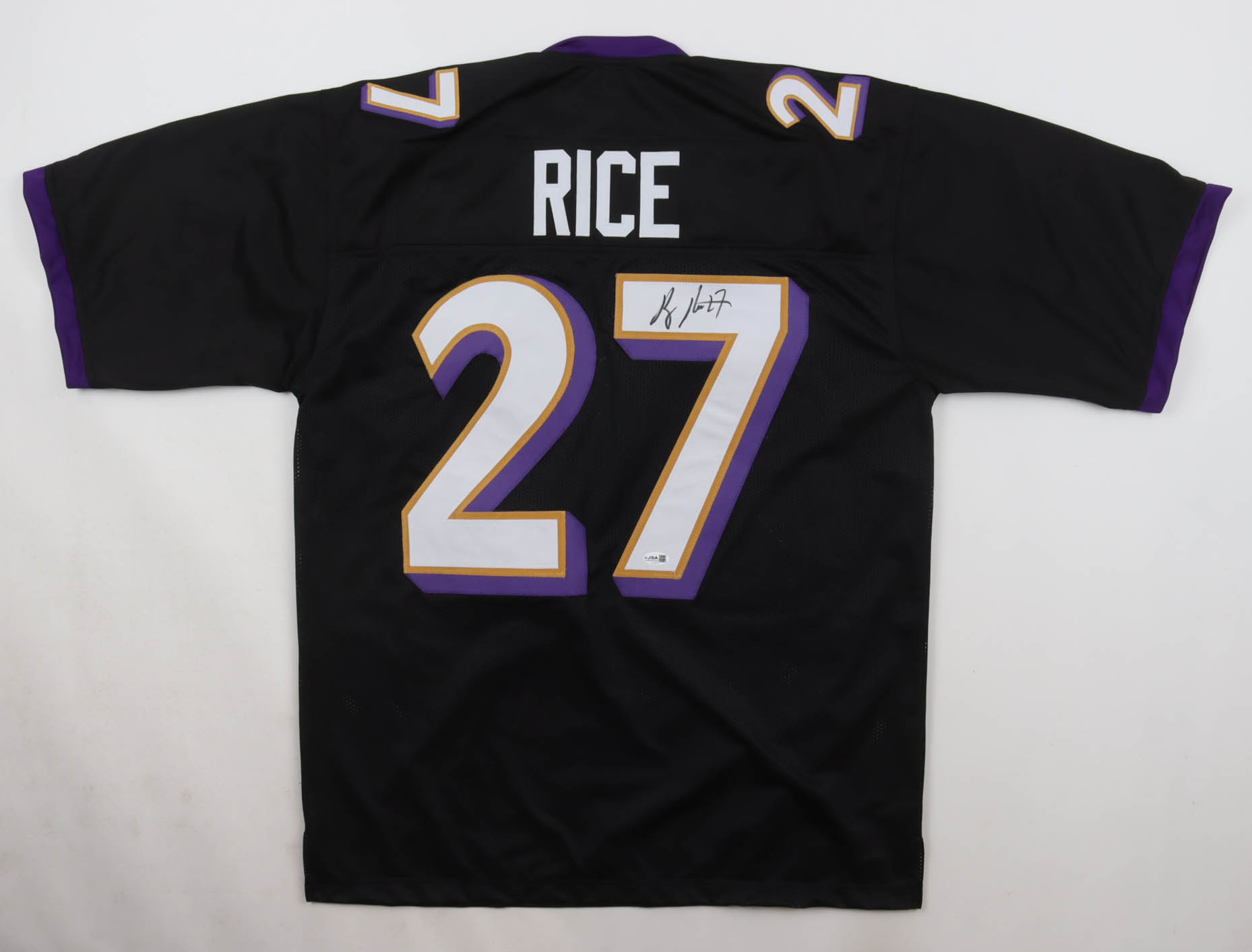 Custom jersey with everything sewn on, size XL. Hand-signed by Ray Rice.