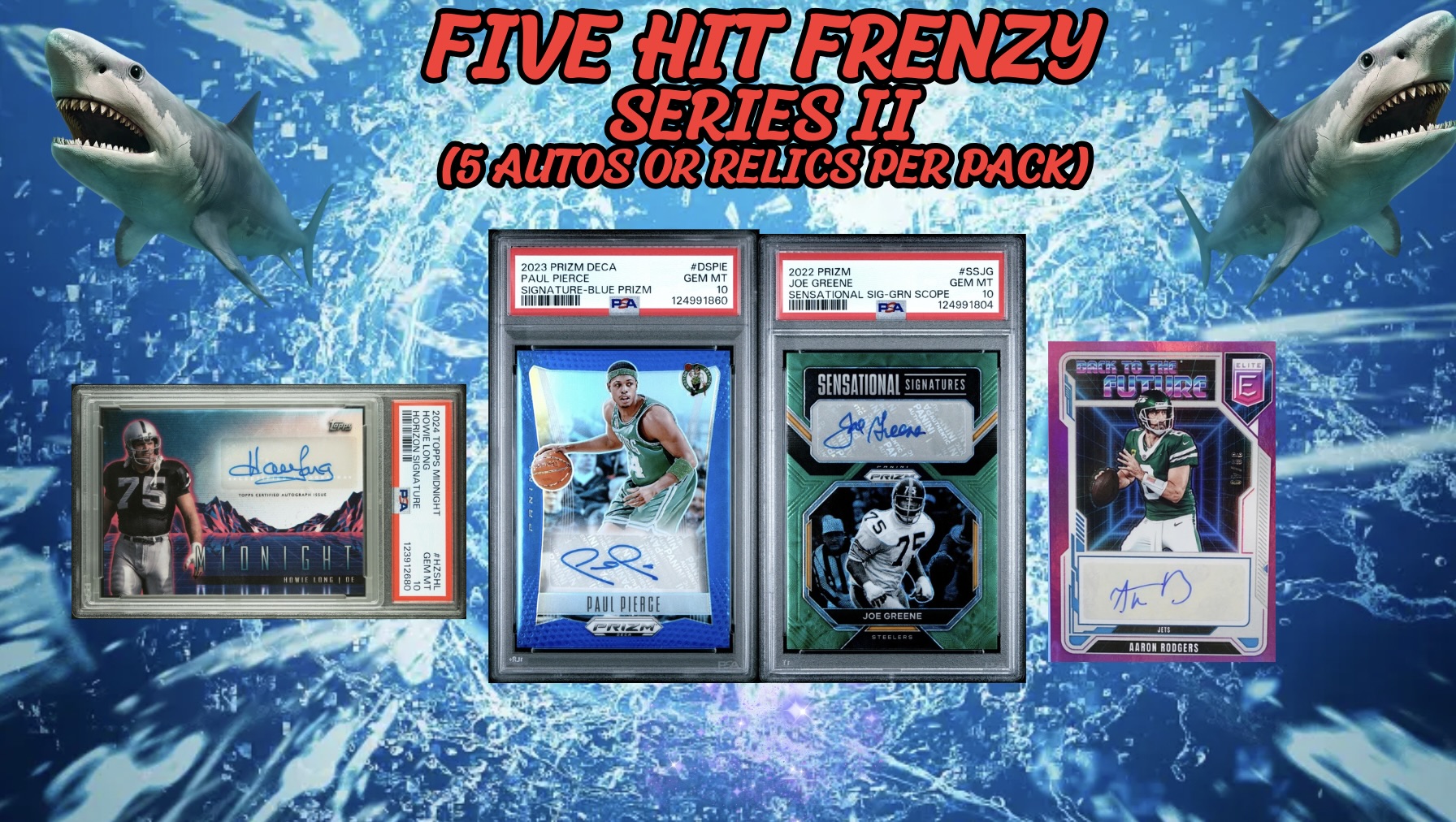 The heat is back. Break King: Five Hit Frenzy Series II returns with great opening experience. Each hit pack guarantees five certified autographs and/or relics, pulling from the football, basketball, baseball, and beyond. Built for collectors who want nothing but memorabilia and autographed cards.