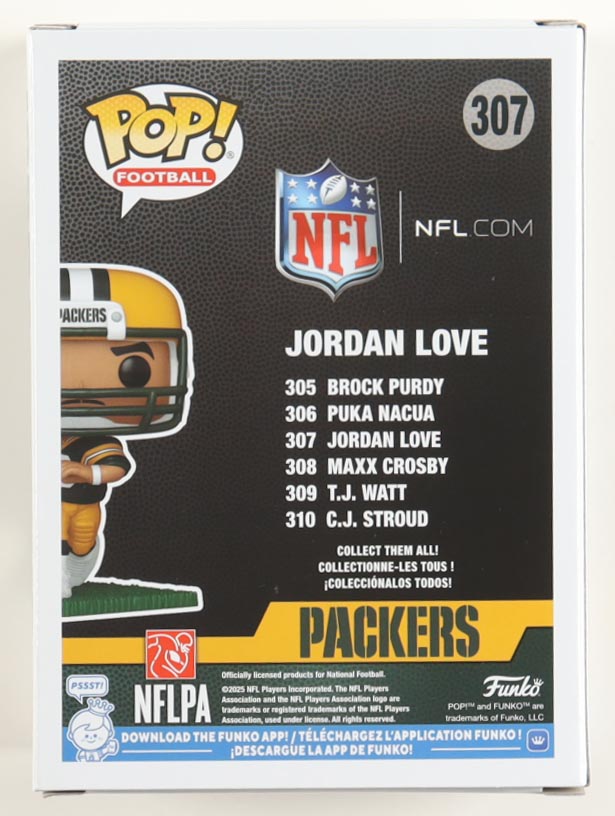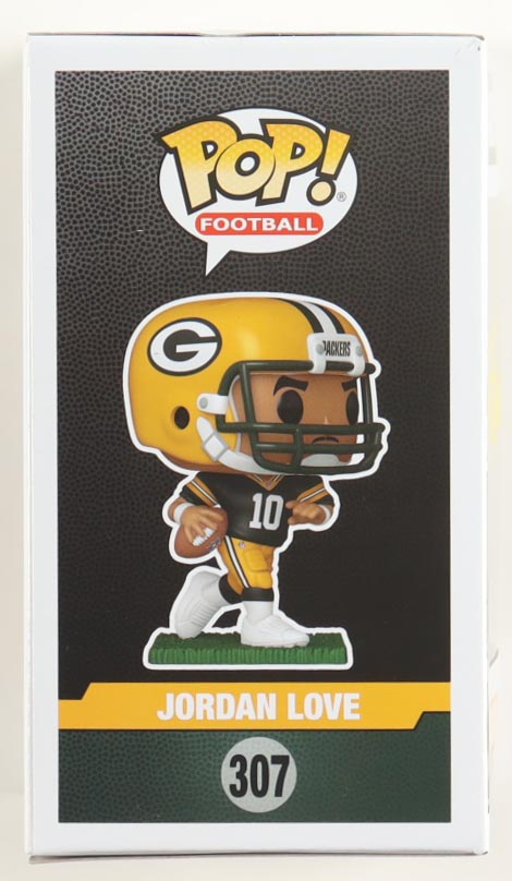 Figure measures approximately 4" tall and has been hand-signed on the packaging by Jordan Love (Green Bay Packers).
