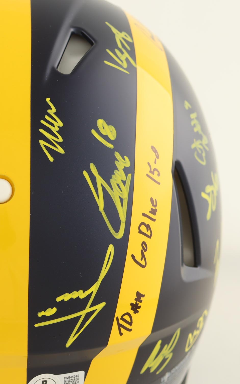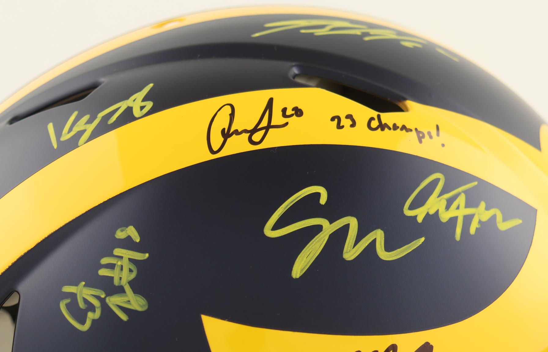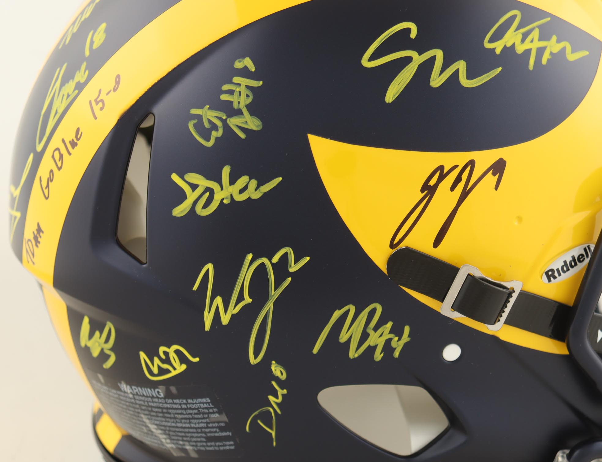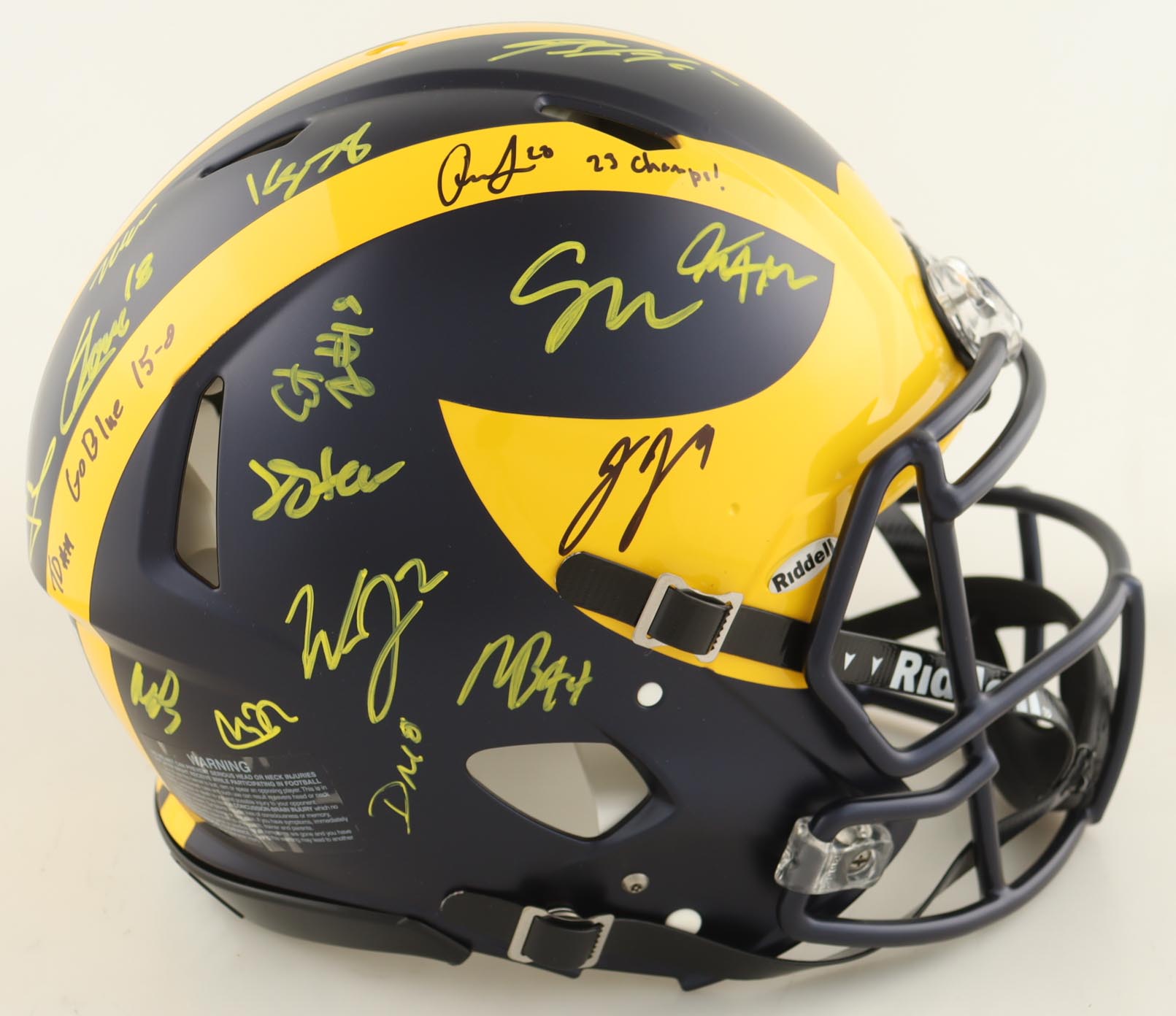 Riddell Michigan Wolverines full-size Authentic On-Field Speed helmet. Hand-signed and inscribed by (17) members of the 2023 Michigan Wolverines National Championship team. Signers include J.J. McCarthy, Max Bredeson, Mike Sainristil, Colston Loveland, Will Johnson, Mason Graham, Derrick Moore, Semaj Morgan, Makari Paige, Myles Hinton, Kalel Mullings, Kenneth Grant, Josiah Stewart, Ernest Huusmann, Blake Corum, Quentin Johnson and Tommy Doman.