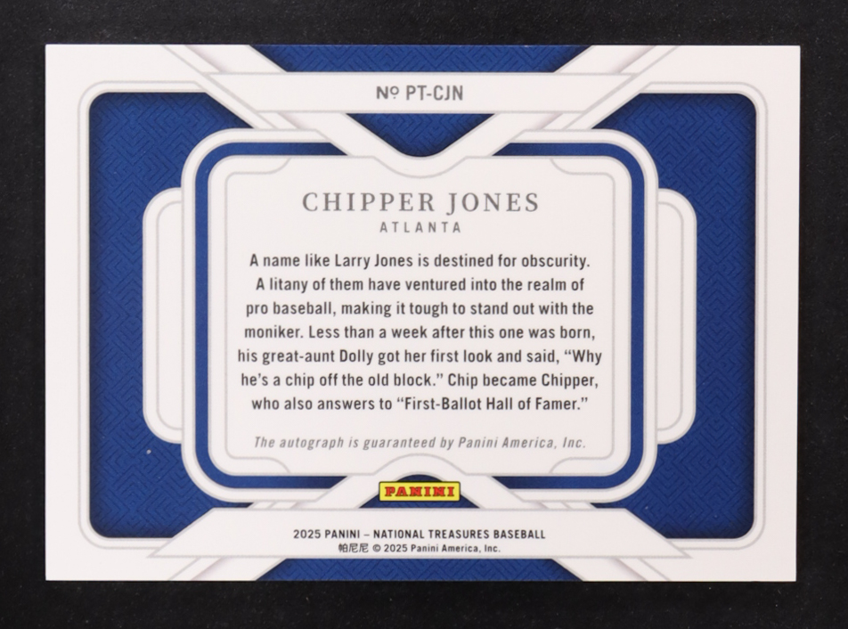 Chipper Jones 2025 Panini National Treasures Personalized Treasures Material Autographs #18 #38/75