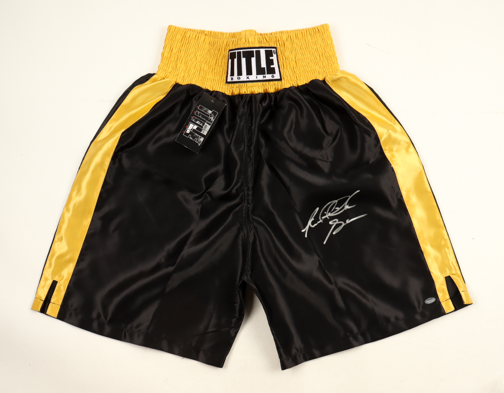 Title Boxing Trunks, size L. Hand-signed by Riddick Bowe (HOF).
