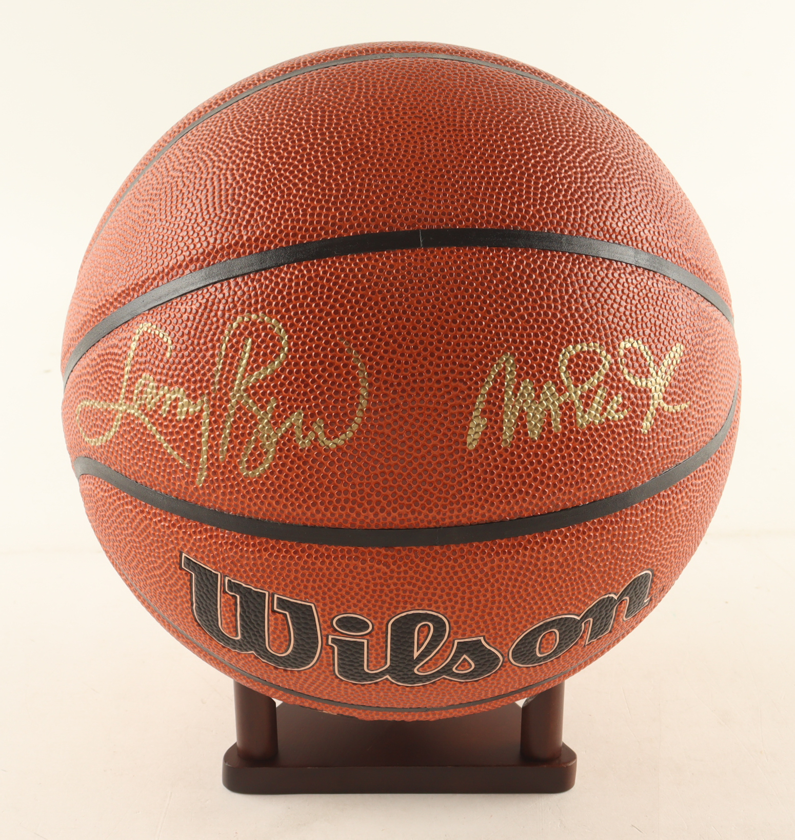 NBA Forge Logo Basketball. Hand-signed by Magic Johnson (Los Angeles Lakers, HOF) and Larry Bird (Boston Celtics, HOF). The display stand is included as shown.