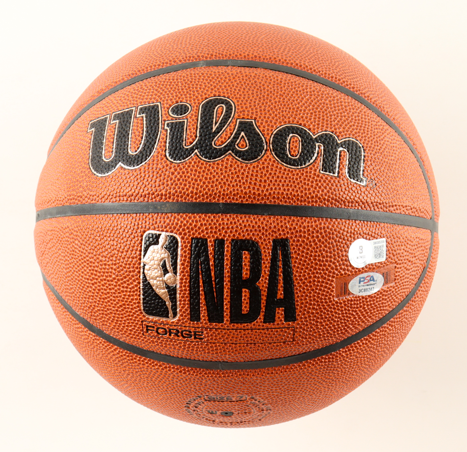 Magic Johnson & Larry Bird Signed NBA Logo Basketball with Display Stand (Beckett & PSA)