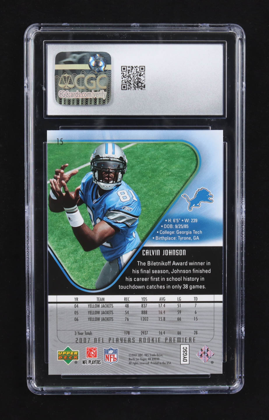 Calvin Johnson 2007 Upper Deck Rookie Premiere #15 RC (CGC 9.5)