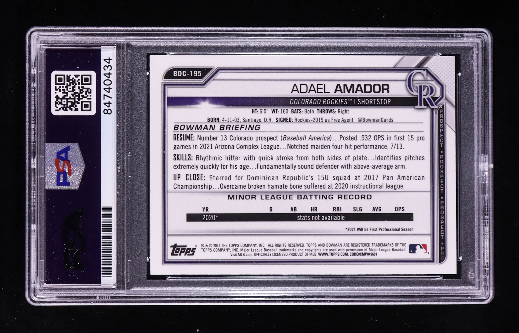 Adael Amador Signed 2021 Bowman Chrome Sapphire #BDC-195 RC (PSA | Autograph Graded PSA 8)