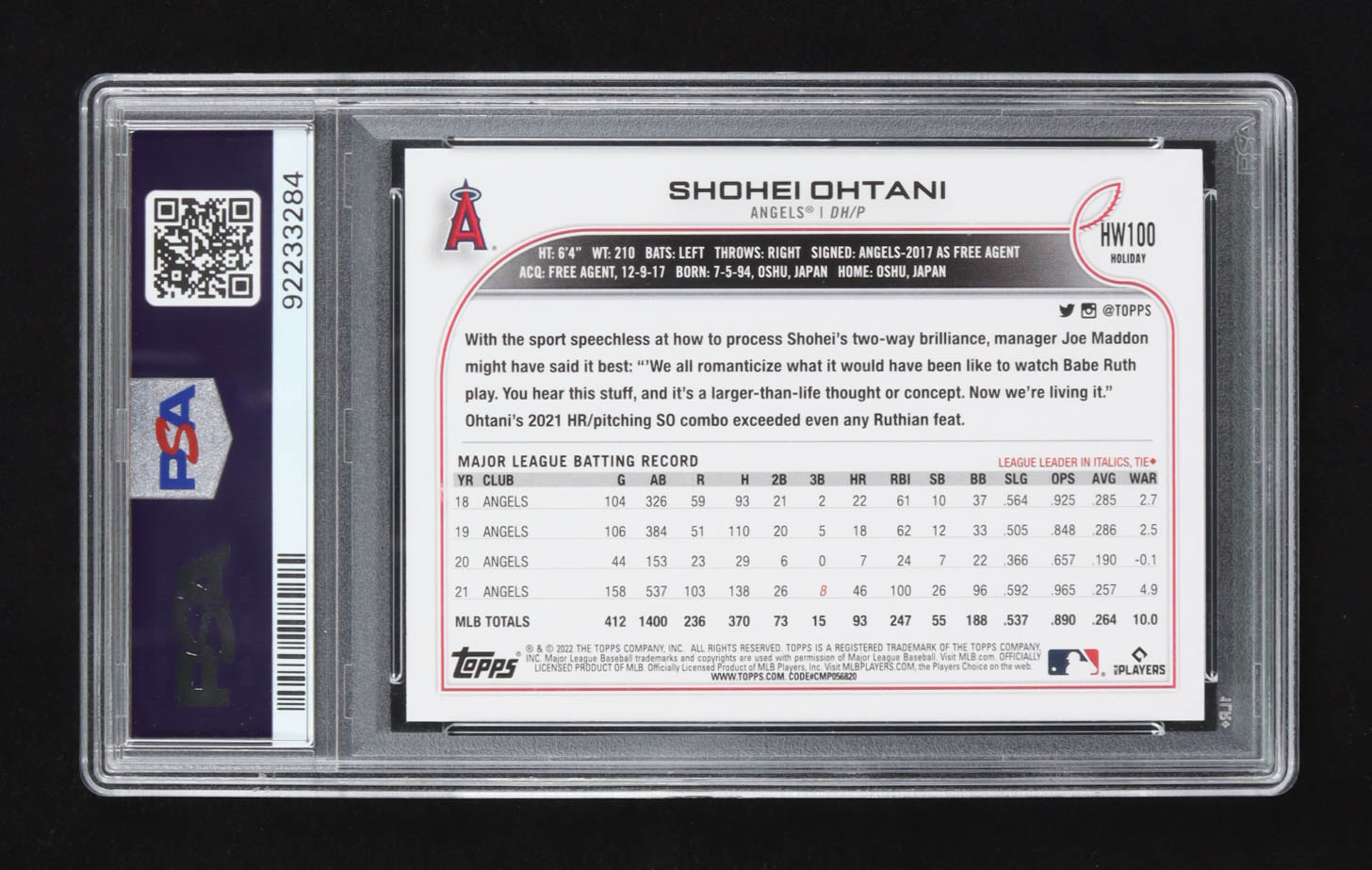 Shohei Ohtani 2022 Topps Holiday Rare Photo Variations #HW100 Santa belt (PSA 10)