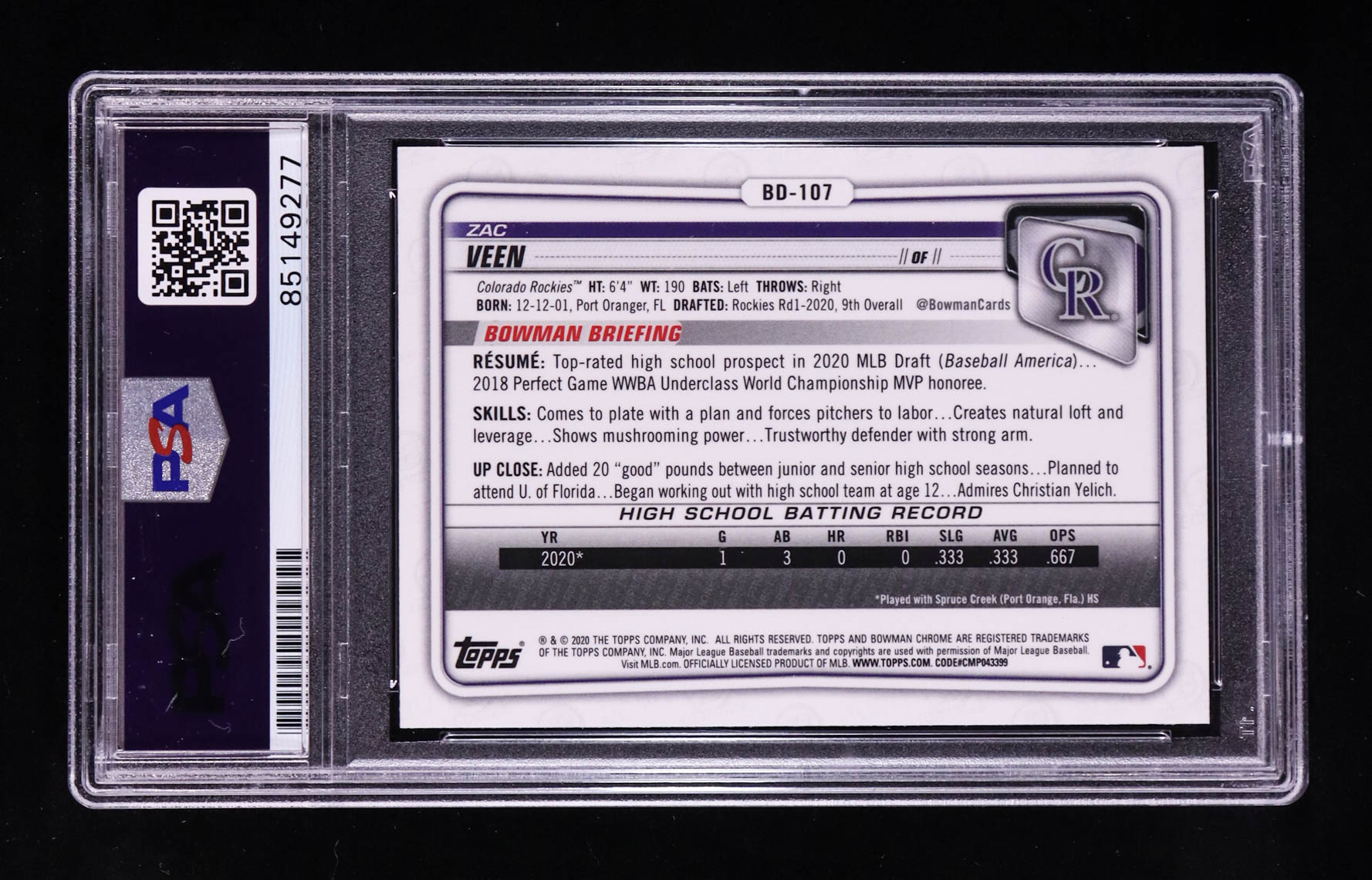 Zac Veen Signed 2020 Bowman Chrome 1st Sapphire #BD-107 RC (PSA)