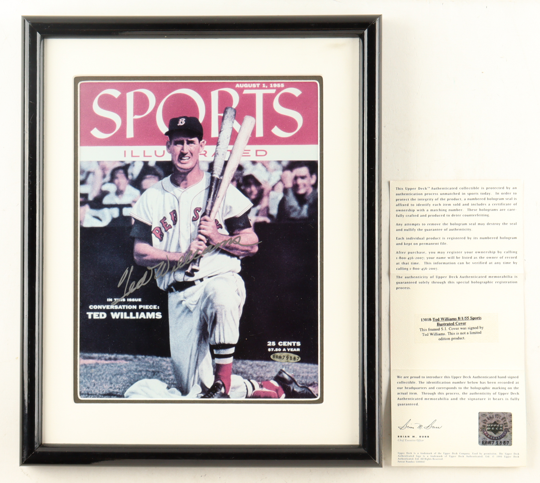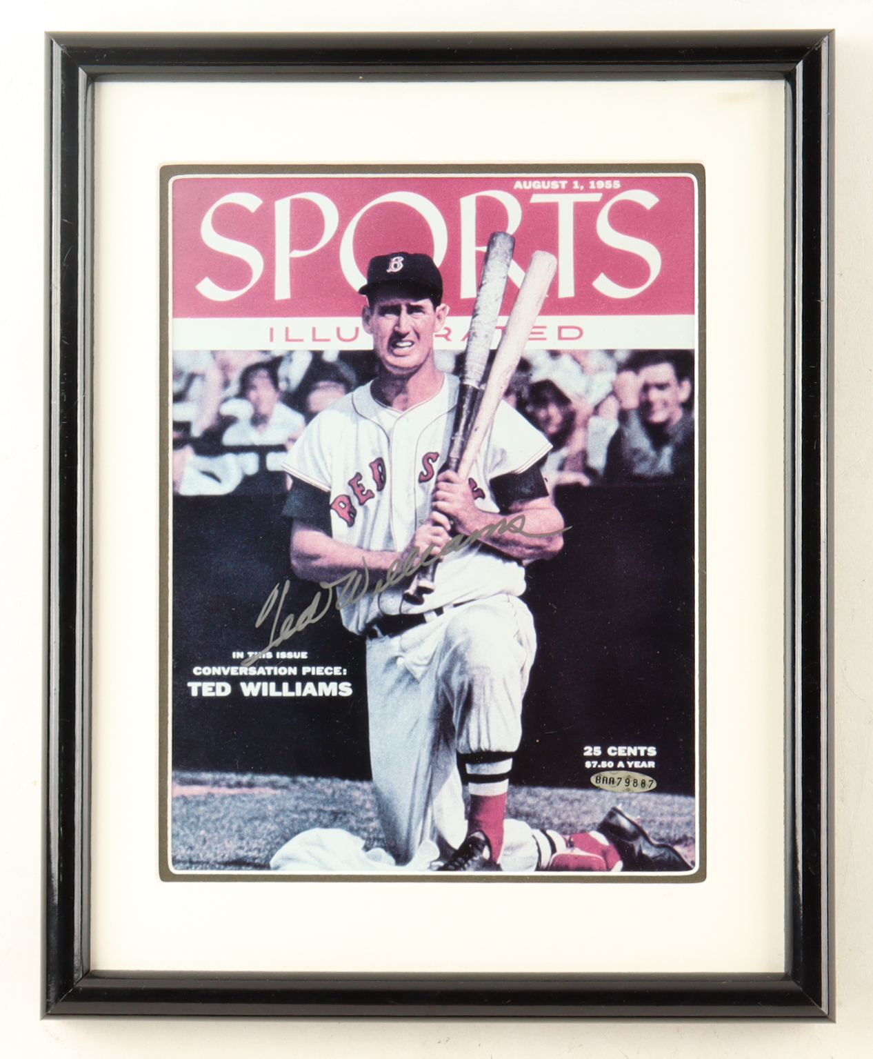 Custom frame measures 12" x 15" in size. Magazine cover is dated August 1, 1955 and has been hand-signed by Ted Williams (D. 2002, Boston Red Sox, HOF).