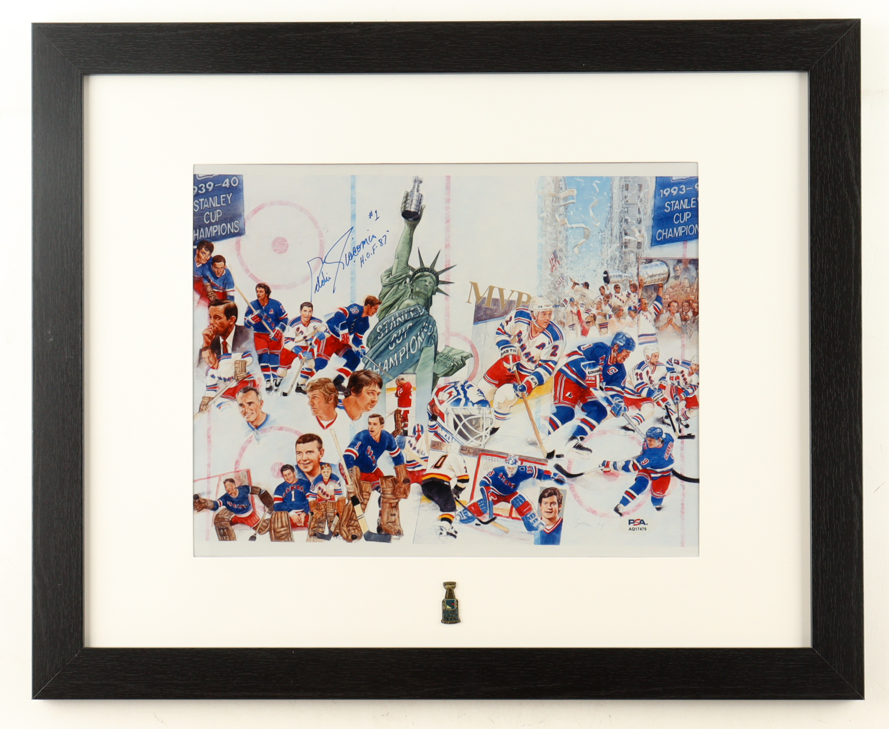 Eddie Giancomin Signed Rangers Custom Framed Art Print Display with Stanley Cup Pin Inscribed "HOF 87" (PSA)