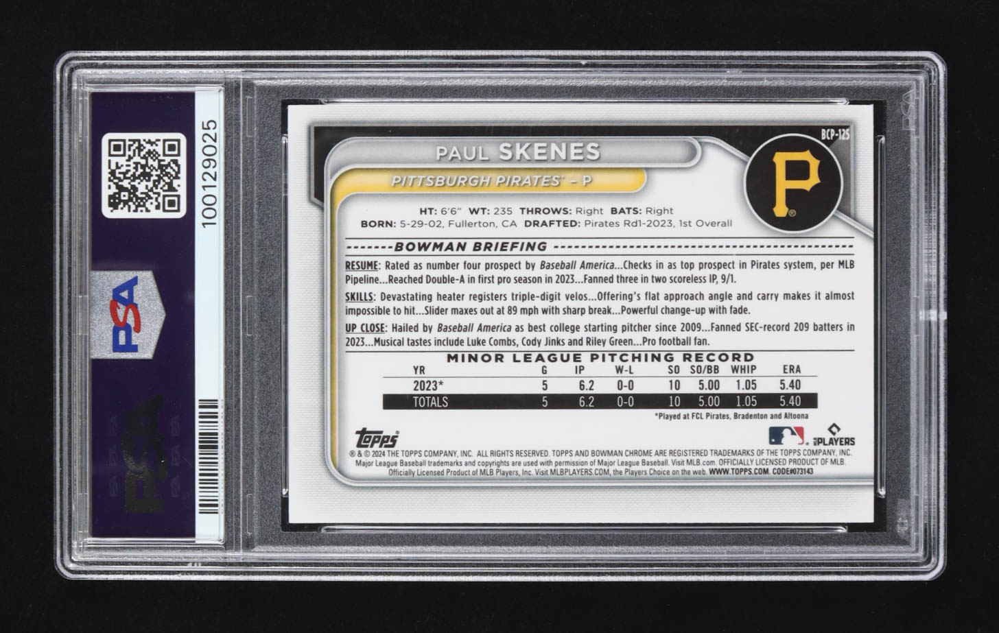 Paul Skenes 2024 Bowman Chrome Prospects Lunar Glow Refractors #BCP125 RC (PSA 10)