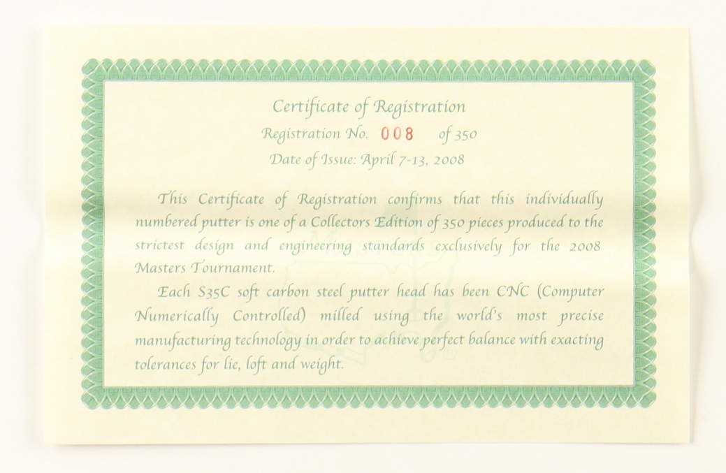 2008 Master Tournament On-Site Only Golf Putter measures 36" in length. Listing also includes the original packaging, putter cover, and full certificate. Please note, item is unsigned and is Limited Edition #8 / 350. Please refer to photos regarding the condition of the item.
