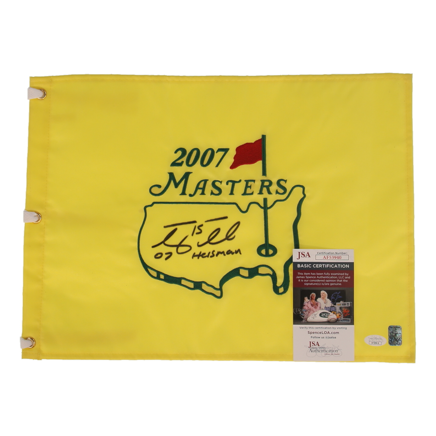 Tim Tebow Signed 2007 Masters Tournament Pin Flag Inscribed "07 Heisman" (JSA)