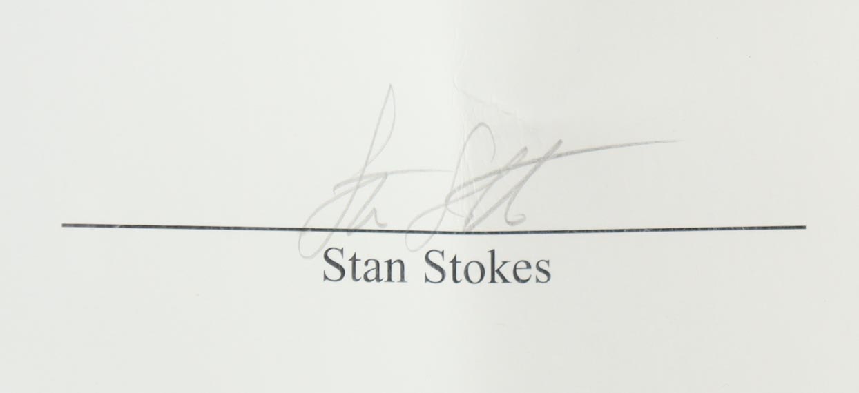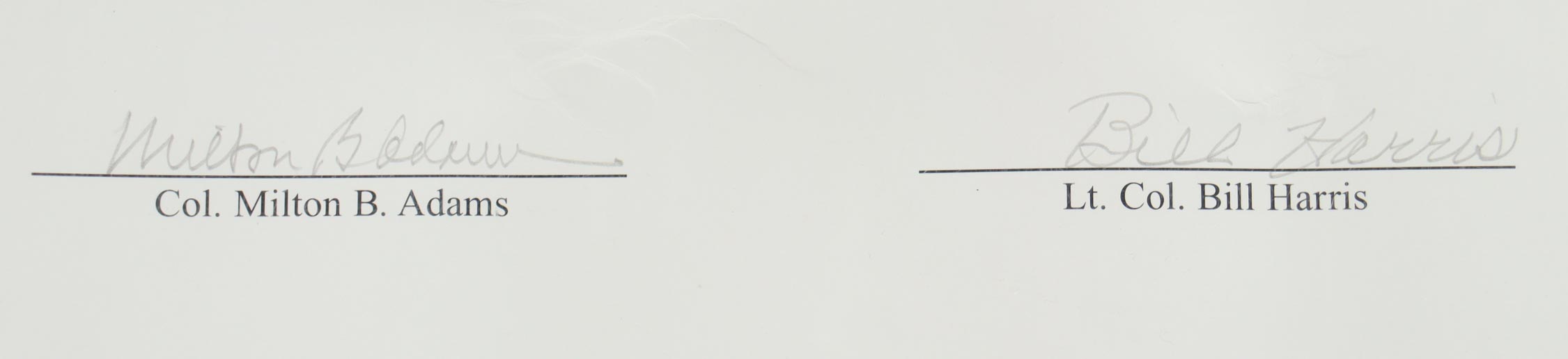 Lithograph measures approximately 18" x 22" in size. Hand-signed by Milton Adams and Bill Harris. Lithograph is also signed by artist Stan Stokes. Please note, there are creases throughout the lithograph.