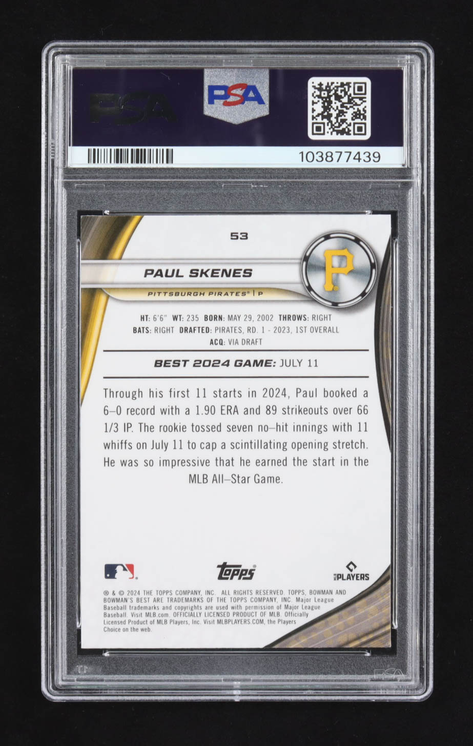 Paul Skenes 2024 Bowman's Best Purple Refractors #53 #137/250 RC (PSA 10)