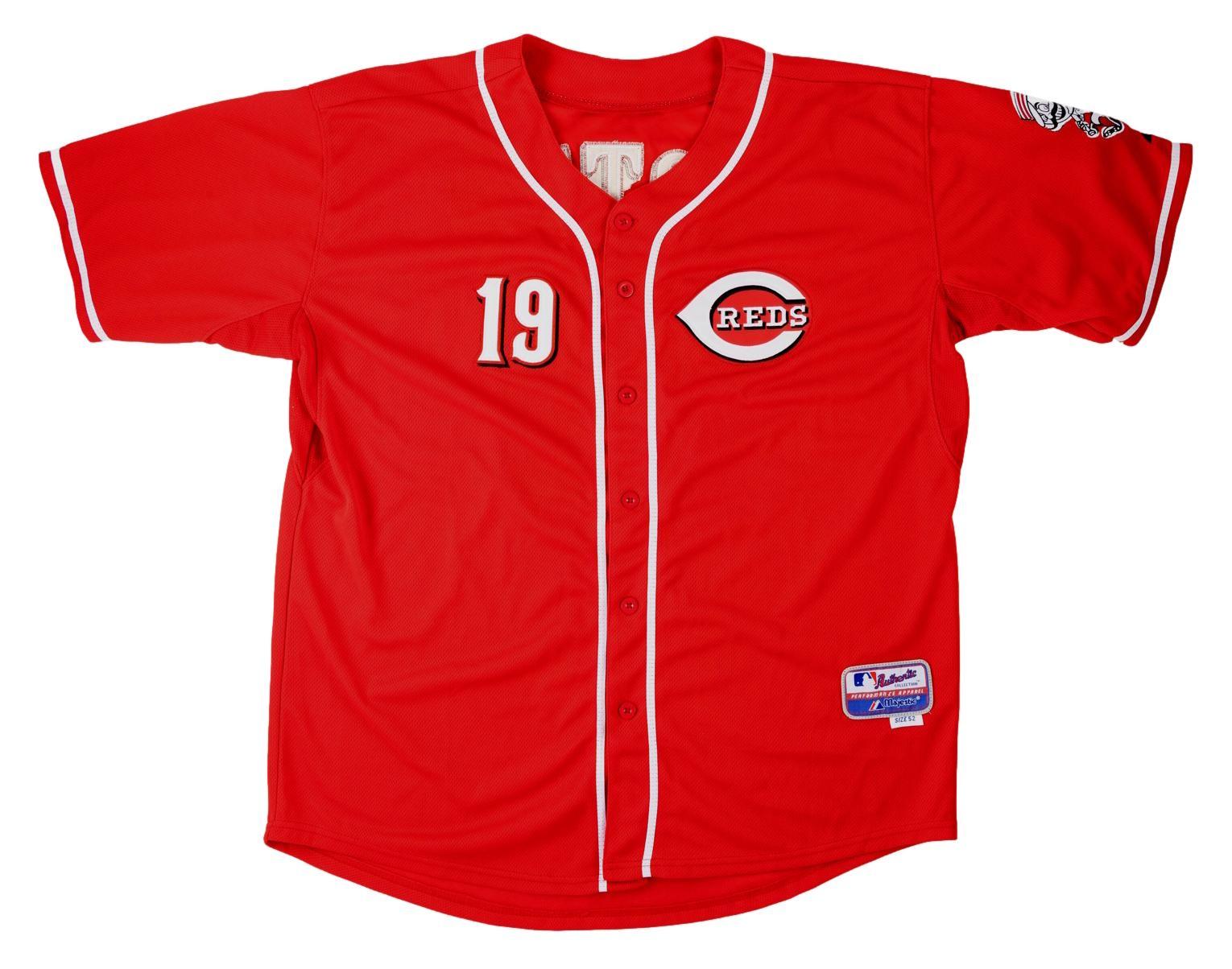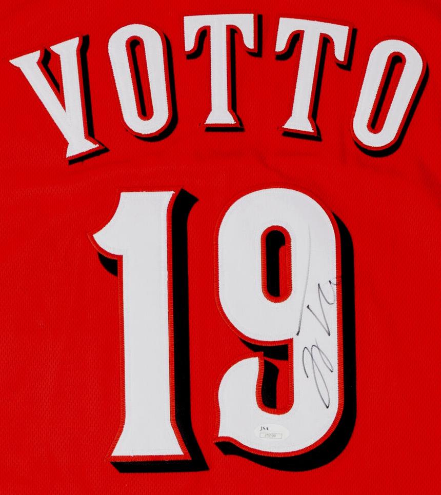 Majestic style jersey with everything sewn on, size 52. Hand-signed by Joey Votto (Cinncinnati Reds).