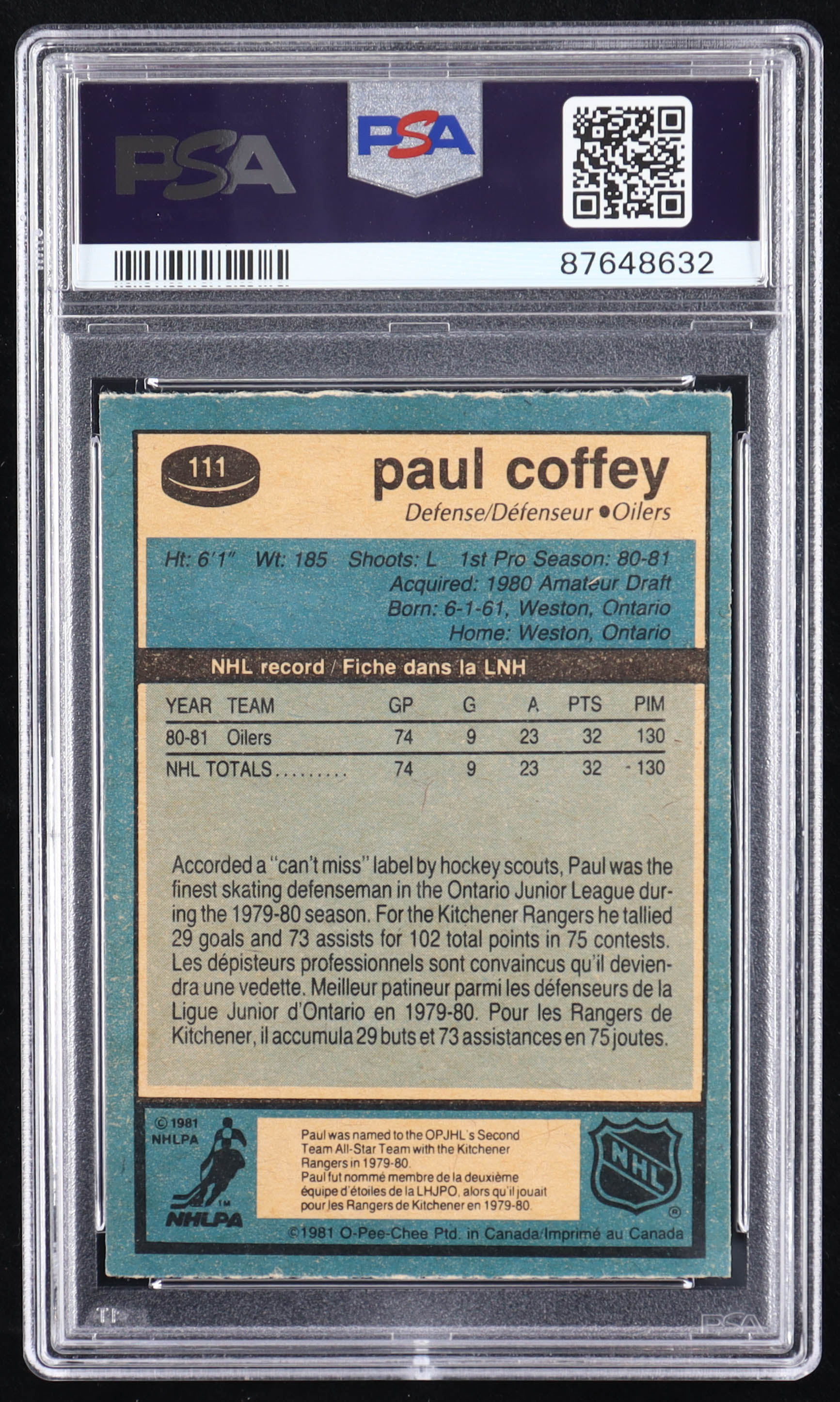 Paul Coffey 1981-82 O-Pee-Chee #111 RC (PSA 8)