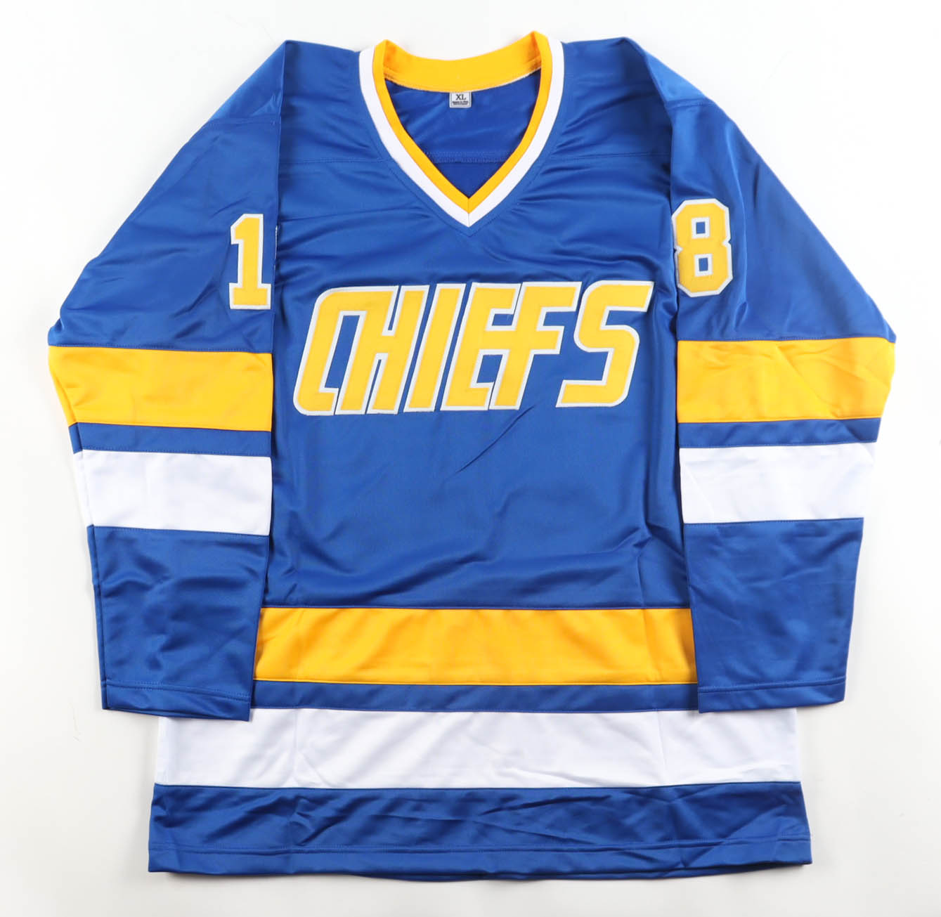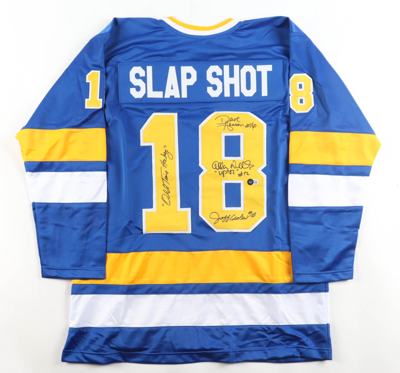 Custom jersey with everything sewn on, size XL. Hand-signed and inscribed by Dave Hanson, Allan Nicholls, and Jeff Carlson (The Hanson Brothers).