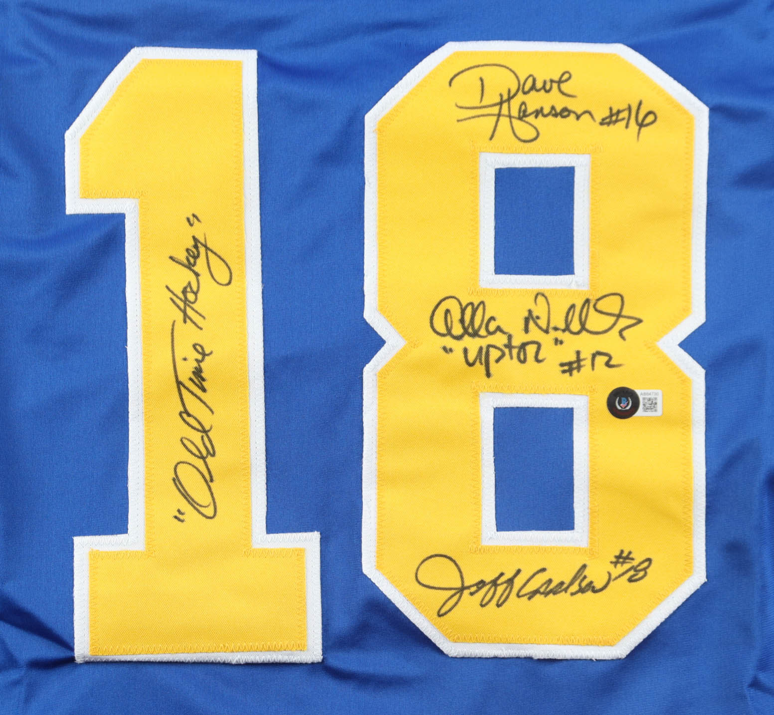 Dave Hanson, Allan Nicholls, & Jeff Carlson Signed Jersey Inscribed "Old Time Hockey" (Beckett)