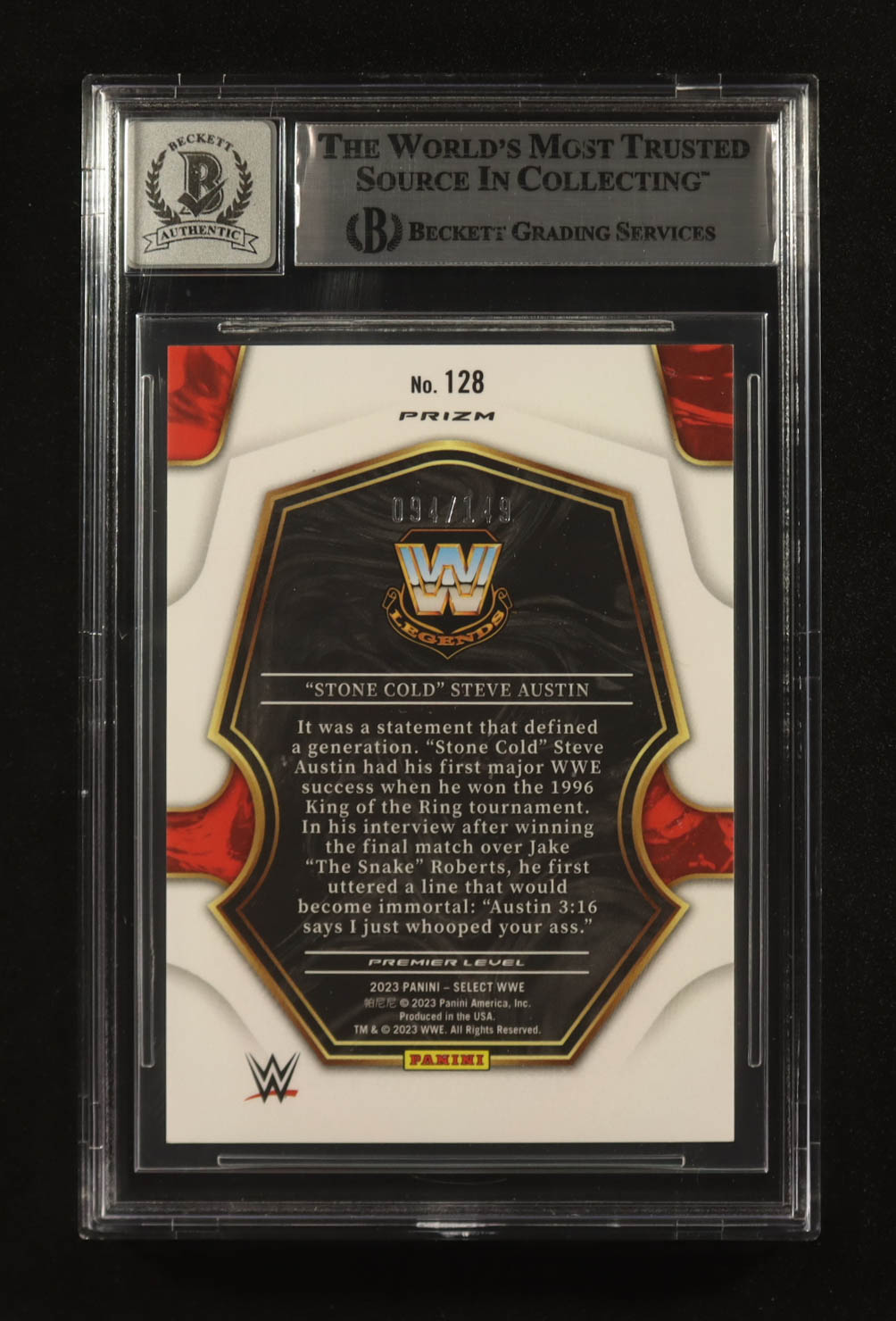 "Stone Cold" Steve Austin Signed 2023 Select WWE Prizms Maroon #128 #094/149 (Beckett | Auto Grade BGS 10)