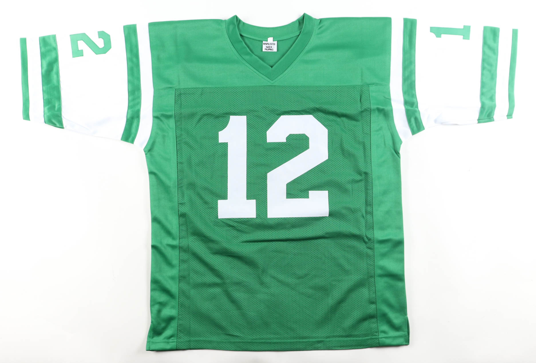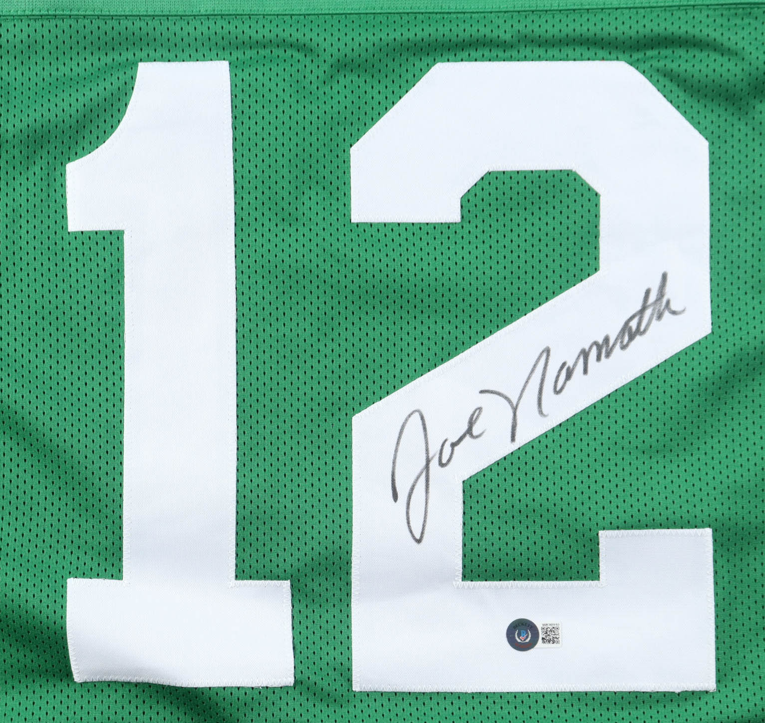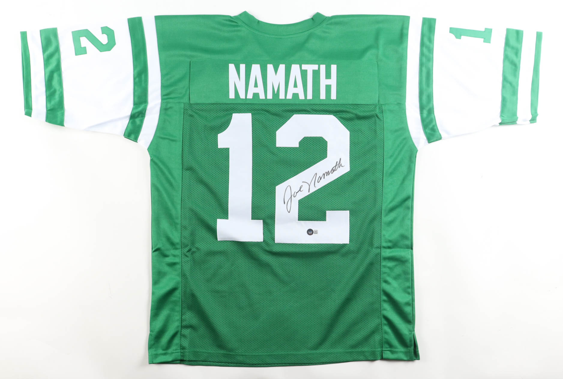 Custom jersey with everything sewn on, size XL. Hand-signed by Joe Namath (New York Jets, HOF).
