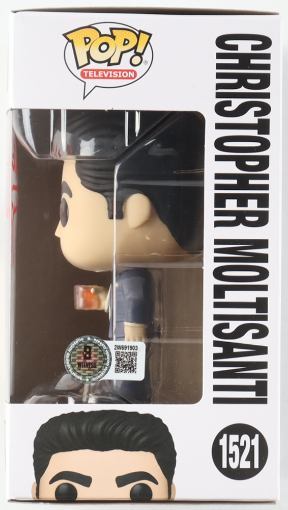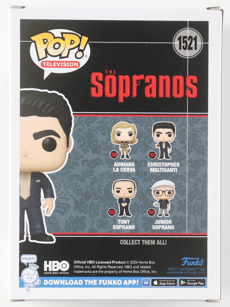 Funko Pop! vinyl figure measures approximately 4" tall. Hand-signed on the packaging by Michael Imperioli (Christopher Moltisanti).