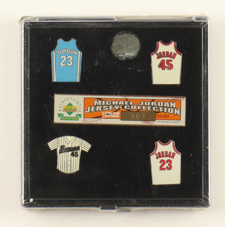 Upper Deck Michael Jordan jersey pin set includes (4) jersey pins. The set is limited edition and has been numbered #903/23,000. Please note, the set is not signed.