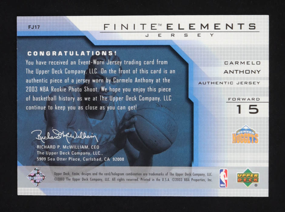 Carmelo Anthony 2003-04 Upper Deck Finite Elements Jerseys #FJ17 RC