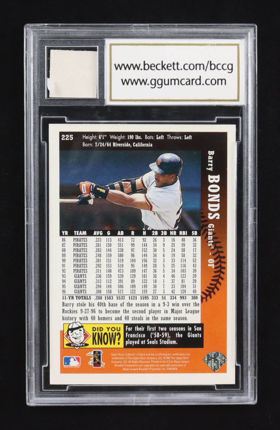 Barry Bonds 1997 Collector's Choice Career HR 499 Bat Relic #225 RC (BCCG 10)