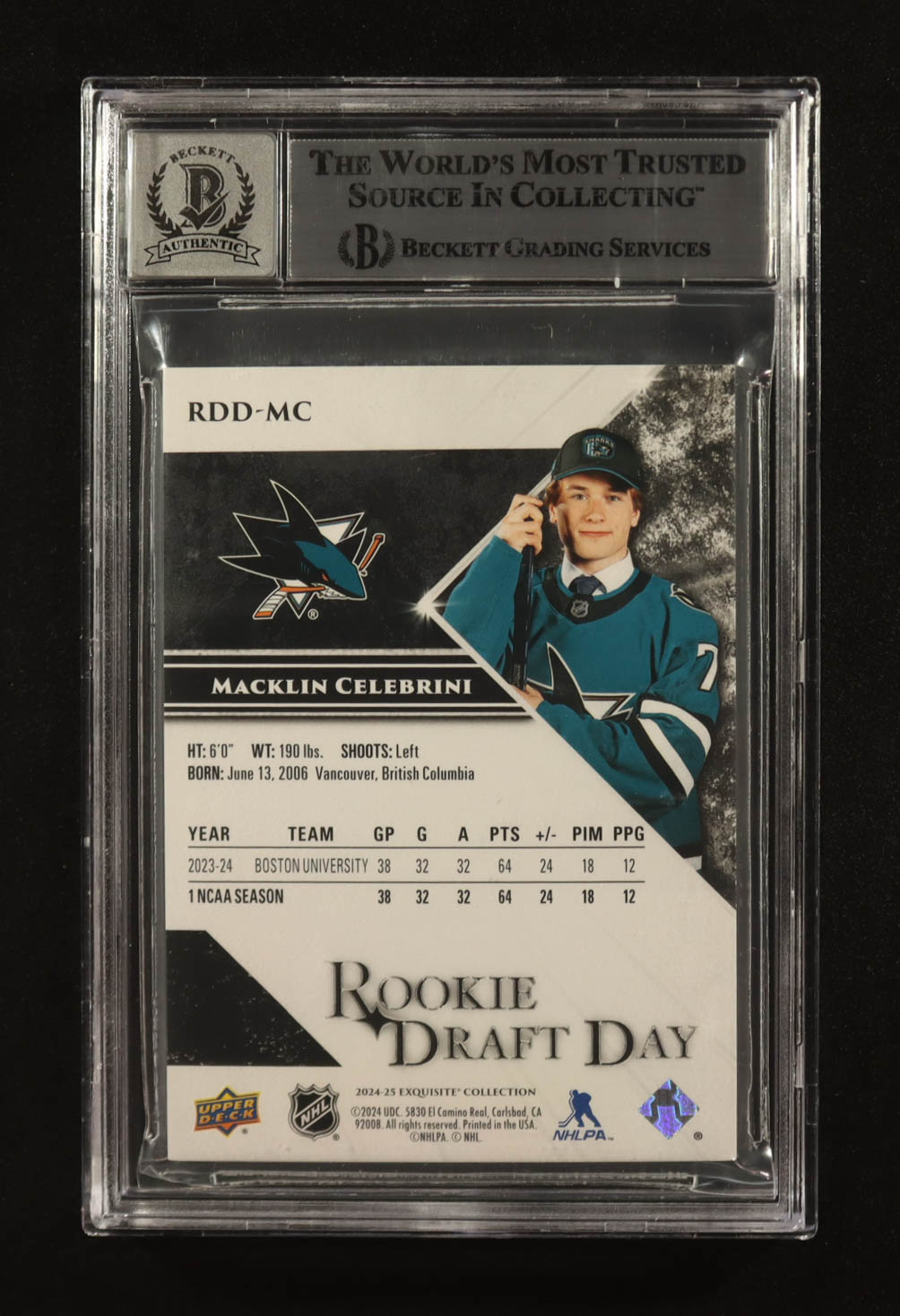 Macklin Celebrini Signed 2024-25 Exquisite Collection Rookie Draft Day #RDDMC #132/349 RC (Beckett | Auto Grade BGS 10)
