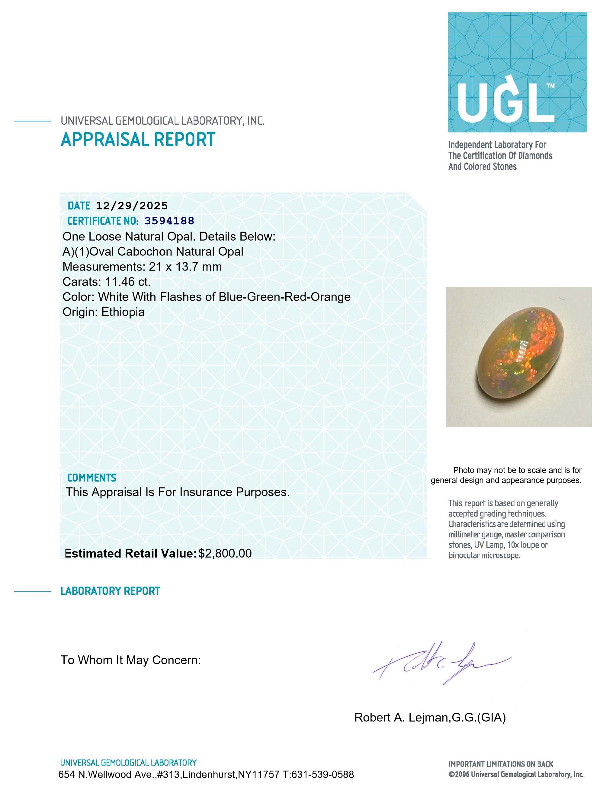 11.46 Carats Natural White Opal Loose | $2,800 Estimated Retail Value (UGL & IGI Certs)
