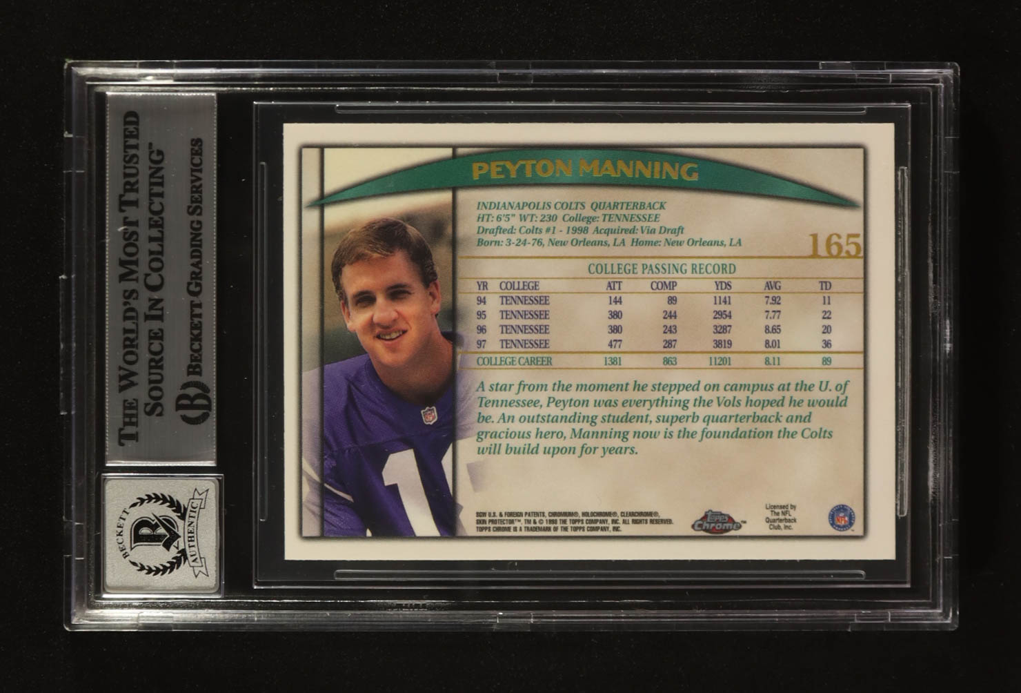 Peyton Manning Signed 1998 Topps Chrome #165 RC (Beckett | Auto Grade BGS 10)