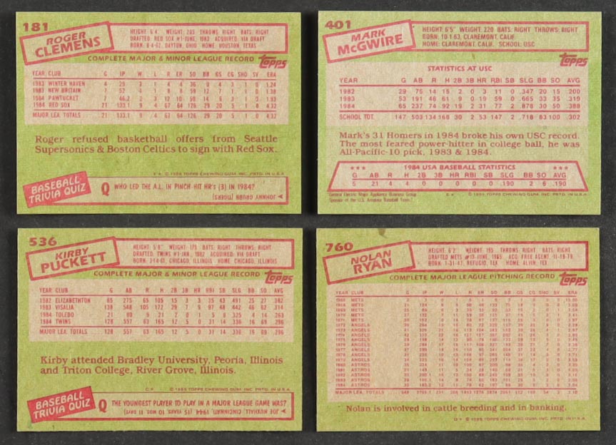 1985 Topps Baseball Complete Set of (792) Cards with Mark McGwire #401 RC, Kirby Puckett #536 RC, Roger Clemens #181 RC, Nolan Ryan #760