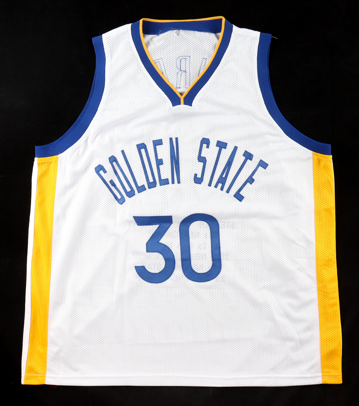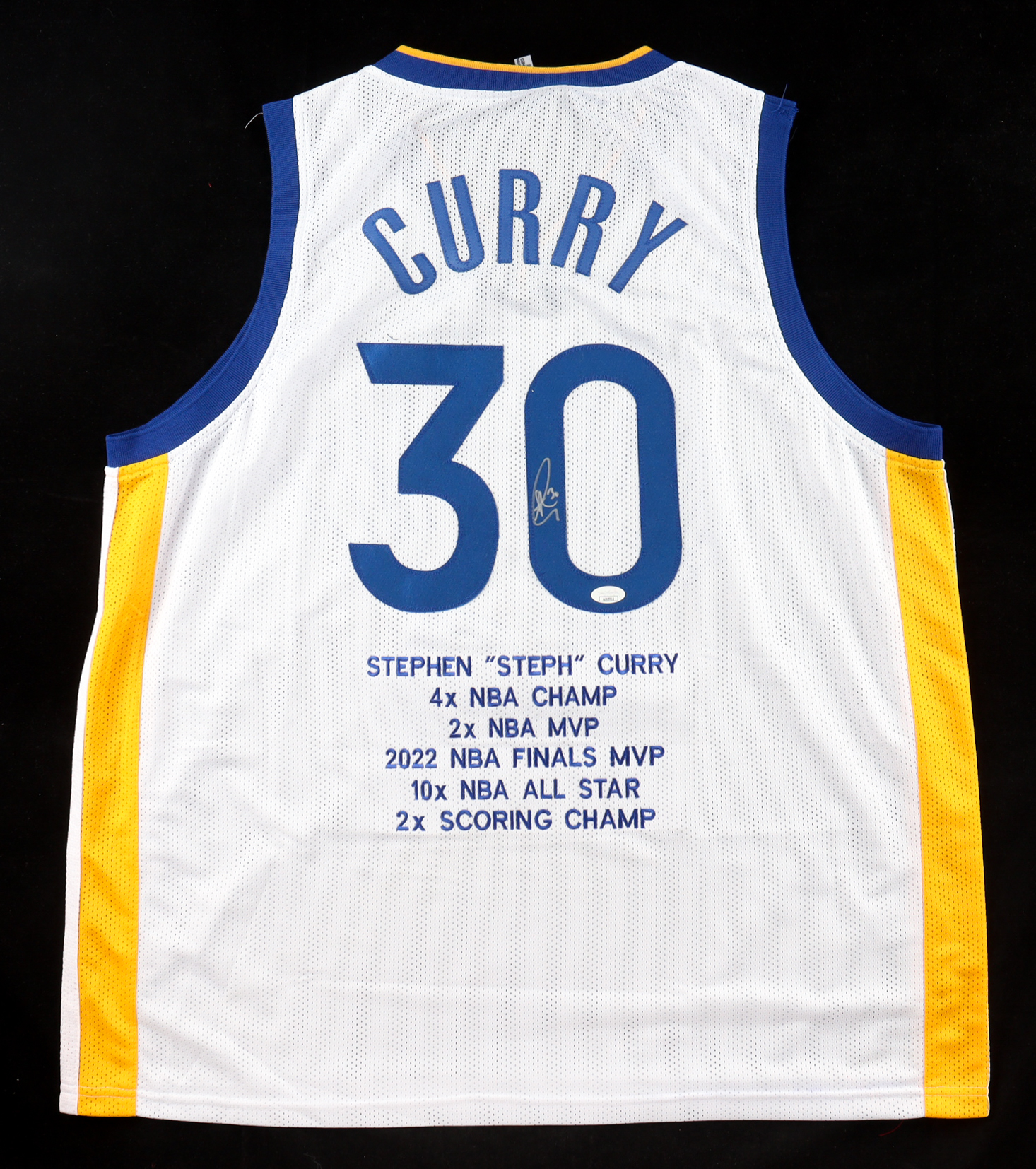 Custom jersey. Everything is sewn on, size XL. Hand-signed by Stephen Curry. Curry's career highlights have been custom stitched onto the back of the jersey below the reverse numbers.