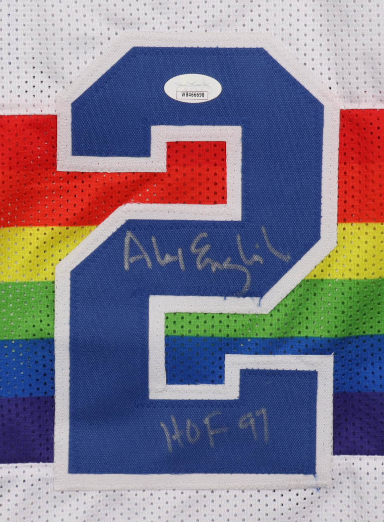 Custom jersey with everything sewn on, size XL. Hand-signed and inscribed by Alex English (Denver Nuggets).