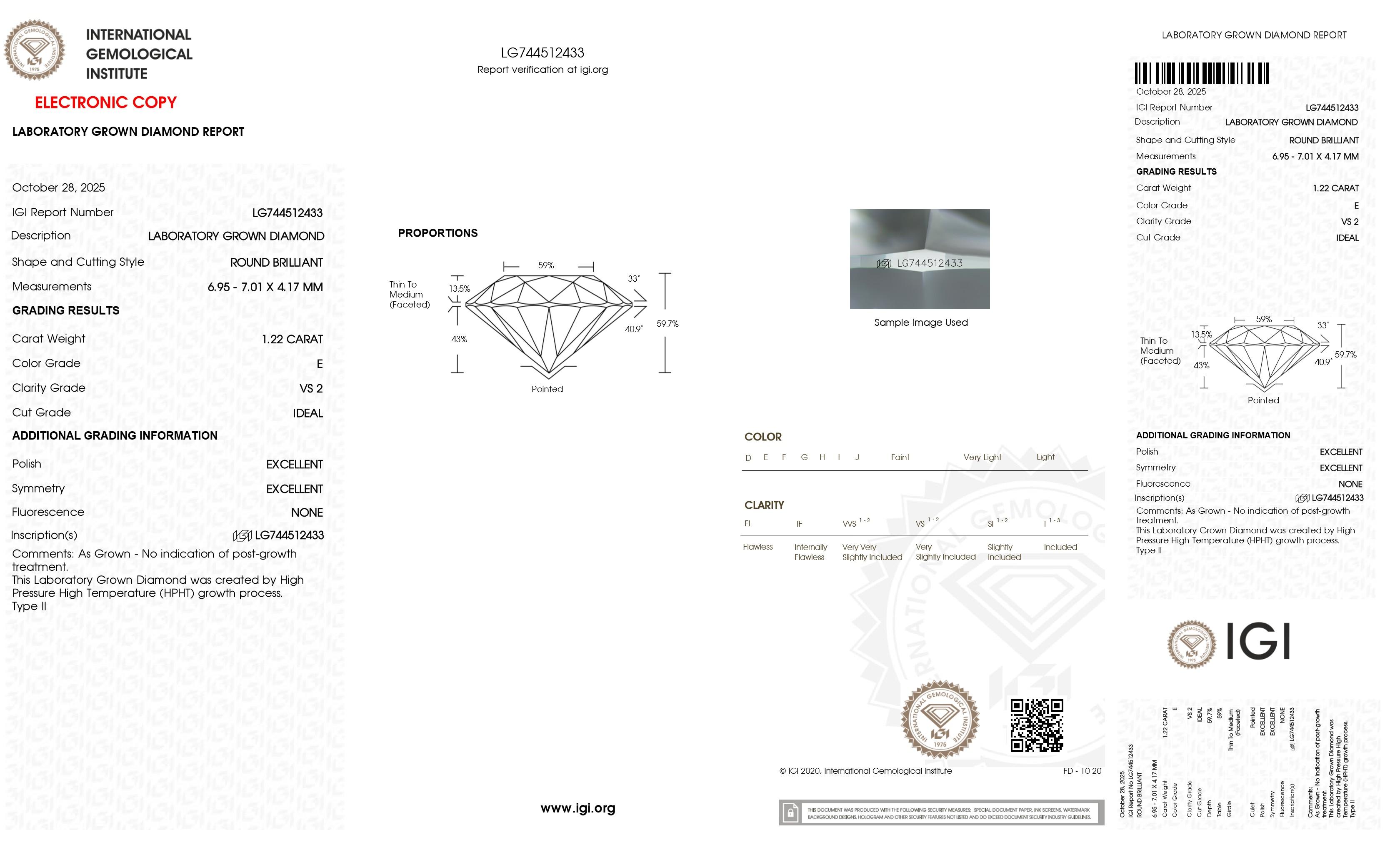 1.22 Carats Lab Grown Diamond Loose E, VS2 | (IGI Cert)