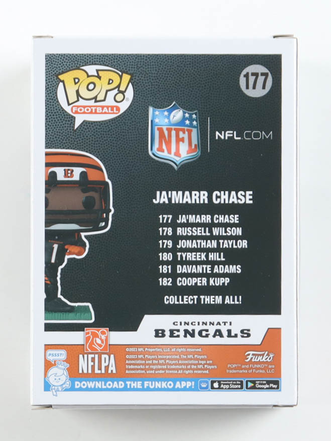 Funko Pop! vinyl figure measures approximately 4" in height and has been hand-signed on the packaging by Ja'Marr Chase (Cincinnati Bengals). Please note, the corners are creased.