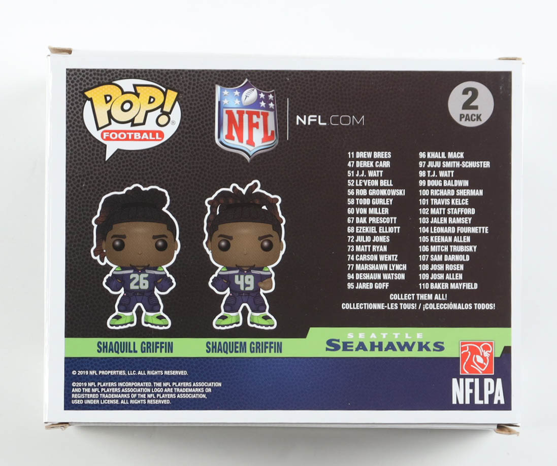 Funko Pop! vinyl figures measure approximately 4" in height and have been hand-signed on the packaging by Shaquill Griffin and Shaquem Griffin. Please note, the corners are creased.