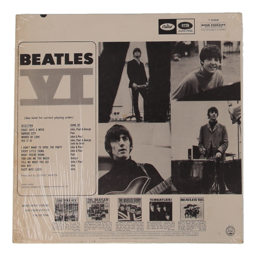1965 "Beatles VI" Vinyl Record Sleeve and Disc. Please see photos for details regarding the item. Note that the item is unsigned and factory sealed.