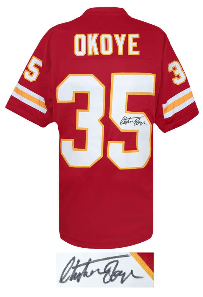 Custom style jersey with everything sewn on, size XL. Hand-signed by Christian Okoye.