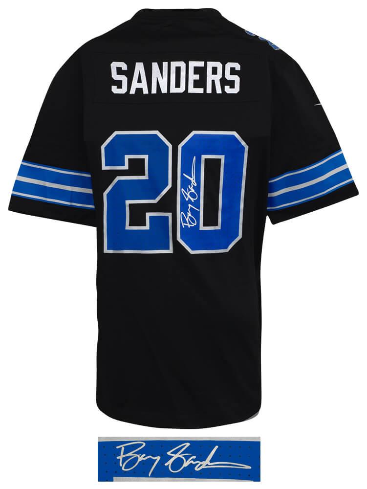 Nike jersey with everything pressed on, size L. Hand-signed by Barry Sanders (Detroit Lions, HOF).