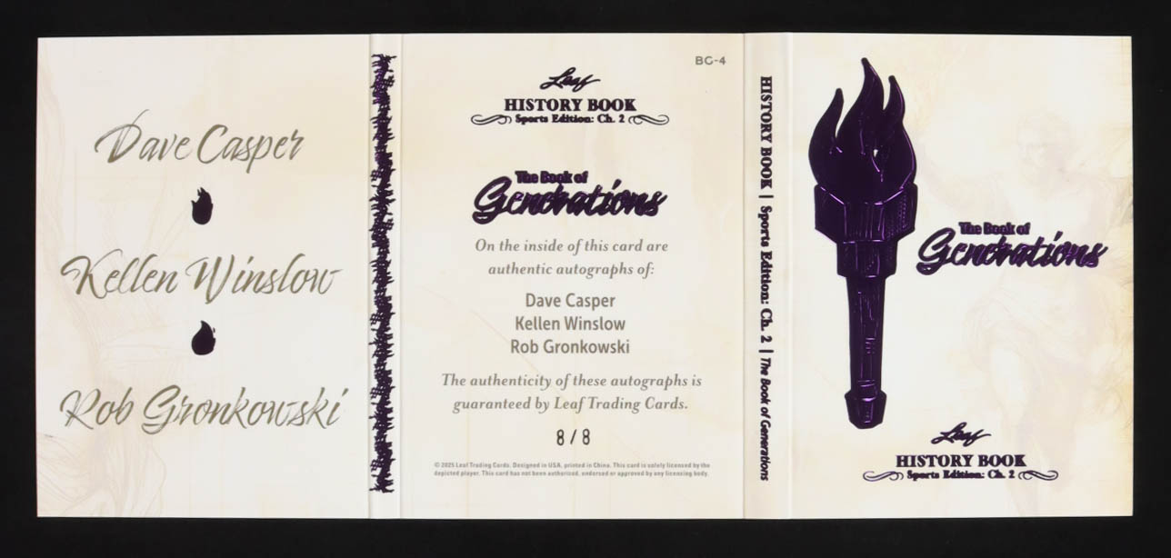 Dave Casper / Kellen Winslow / Rob Gronkowski 2025 Leaf History Book Ch. 2 Th Book of Generations Purple Triple Auto #BC-4 #8/8