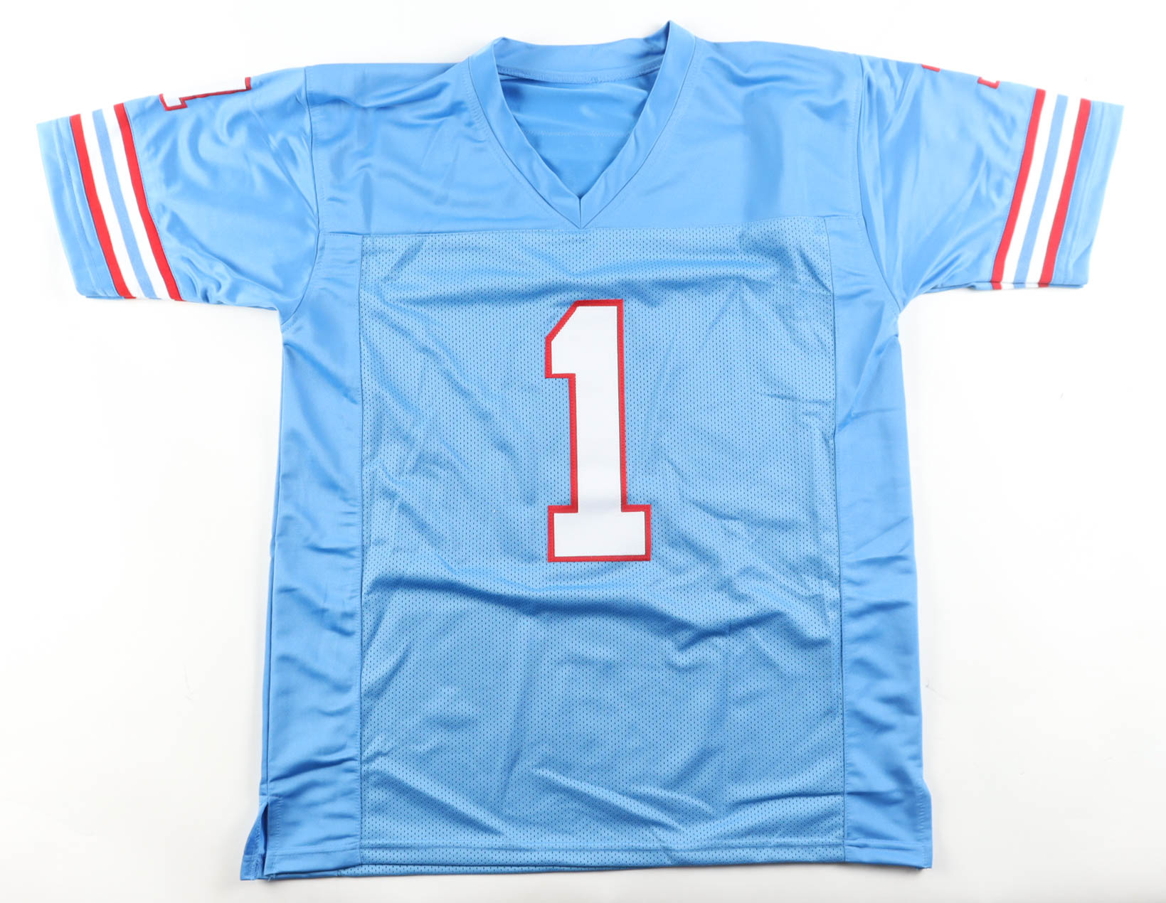 Custom jersey with everything sewn on, size XL. Hand-signed and inscribed by Warren Moon (HOF).