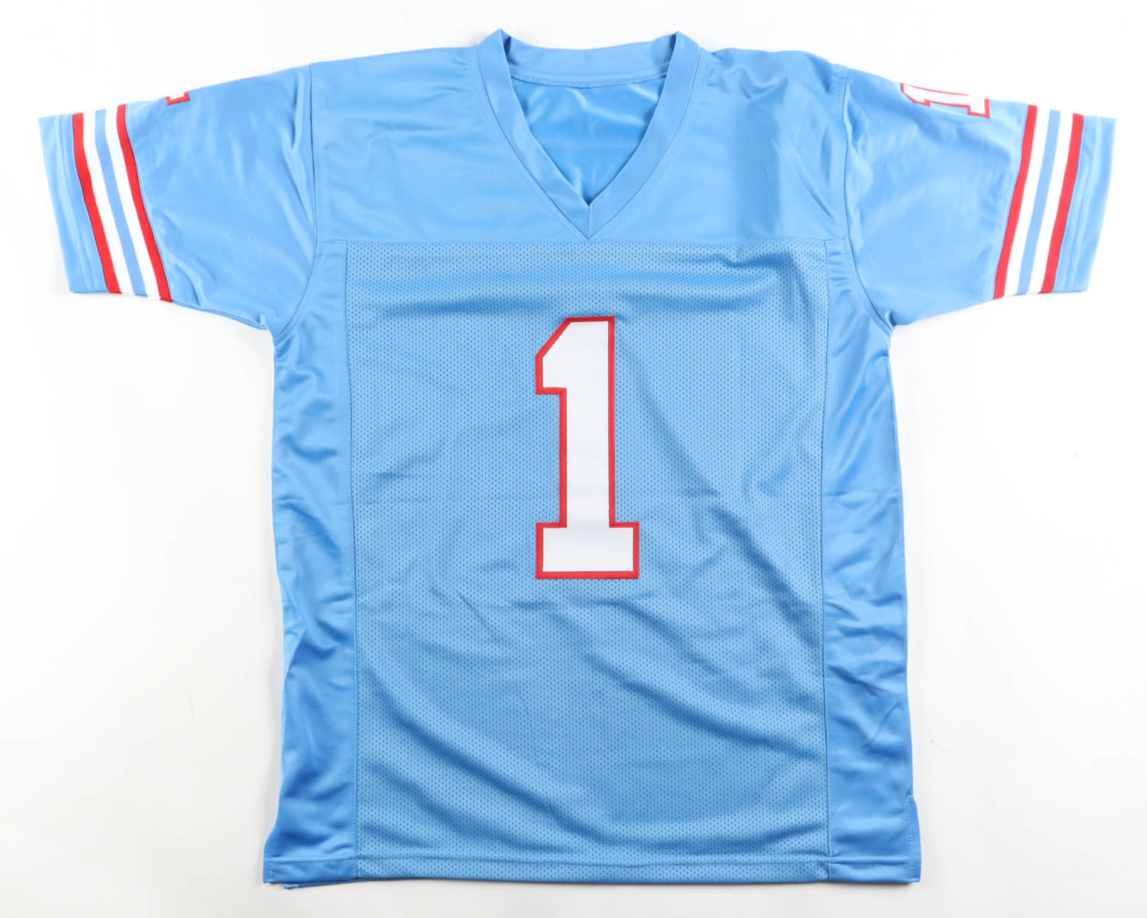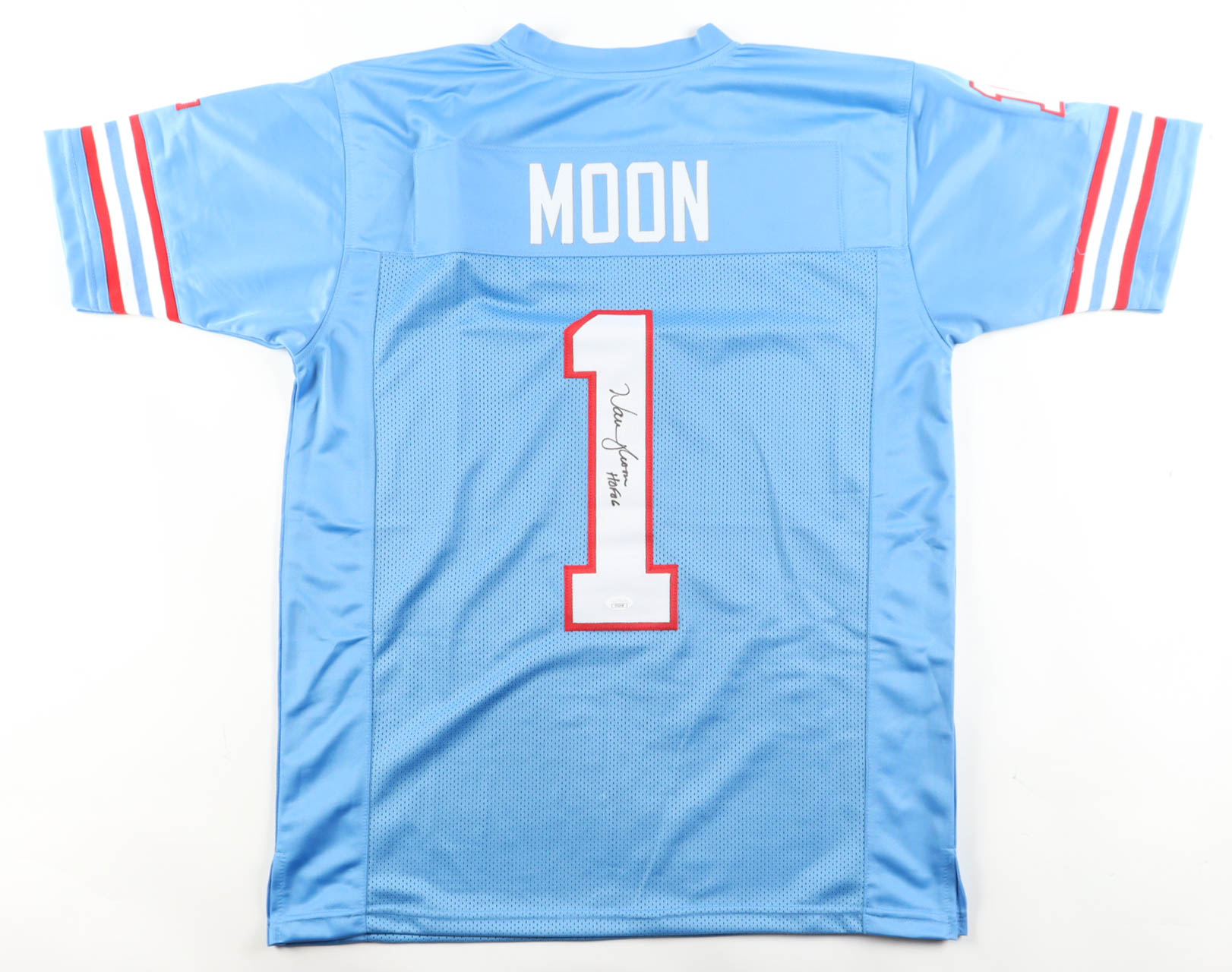 Custom jersey with everything sewn on, size XL. Hand-signed and inscribed by Warren Moon (HOF).