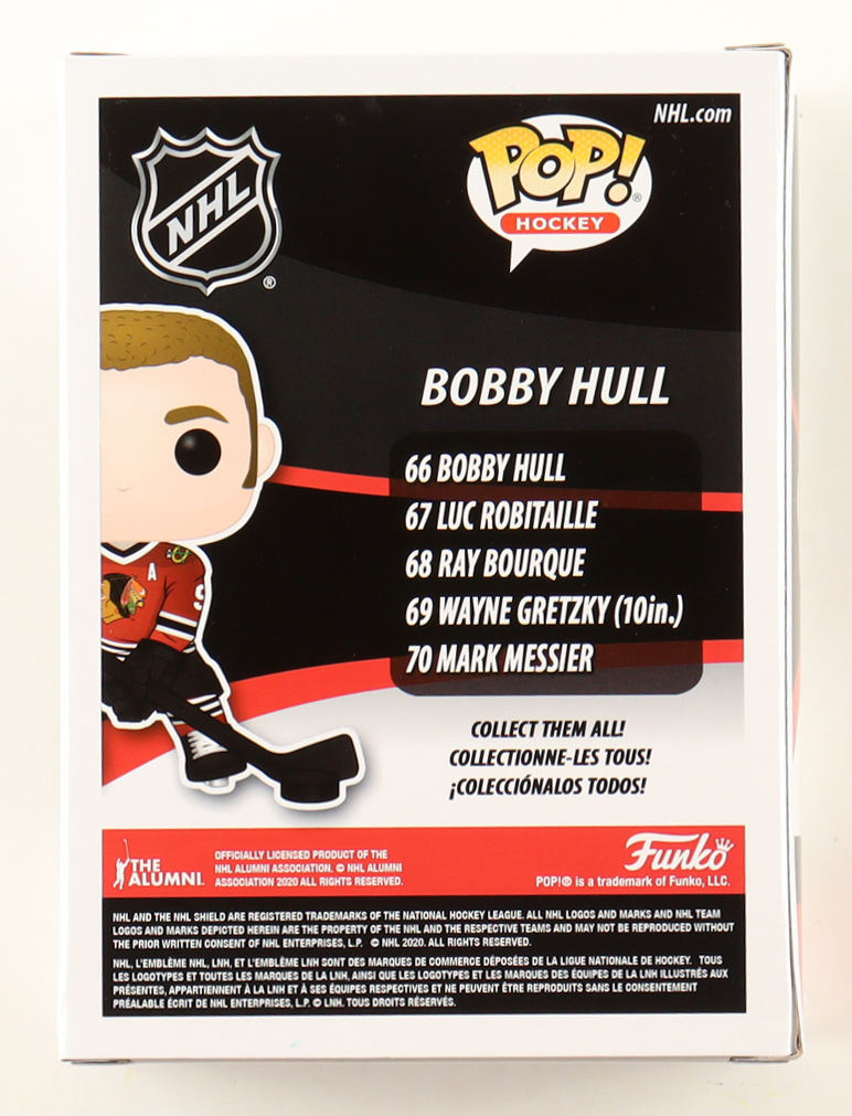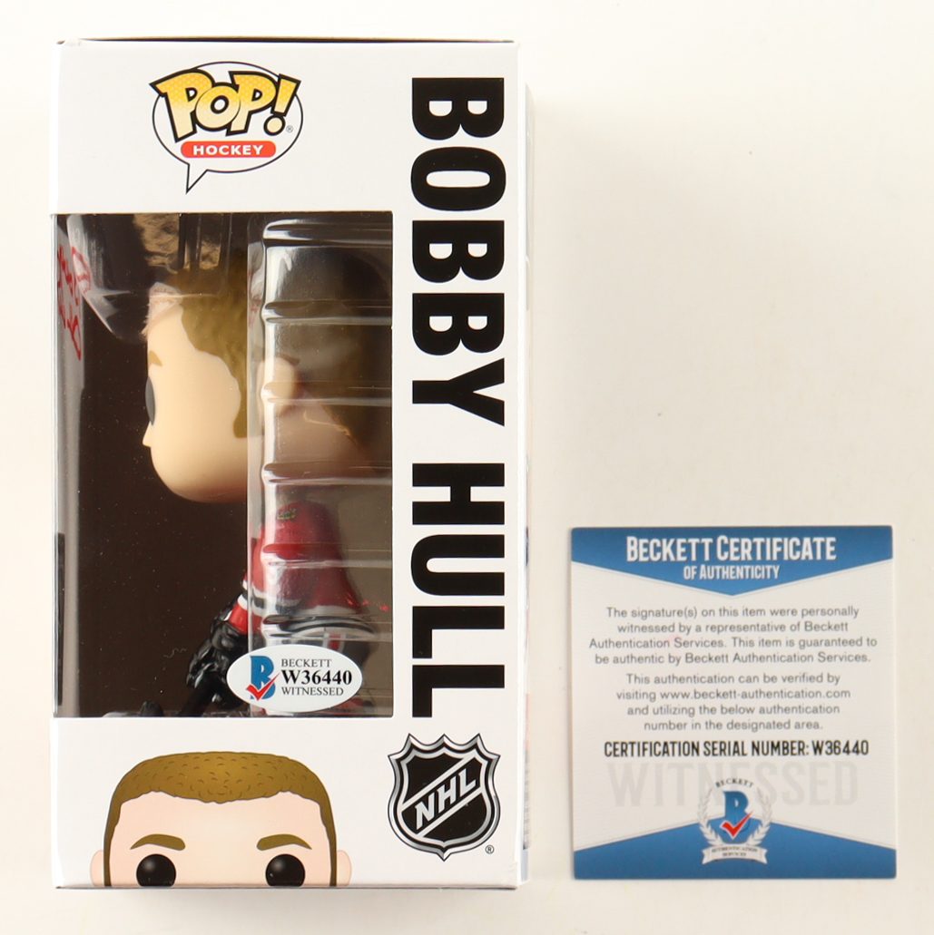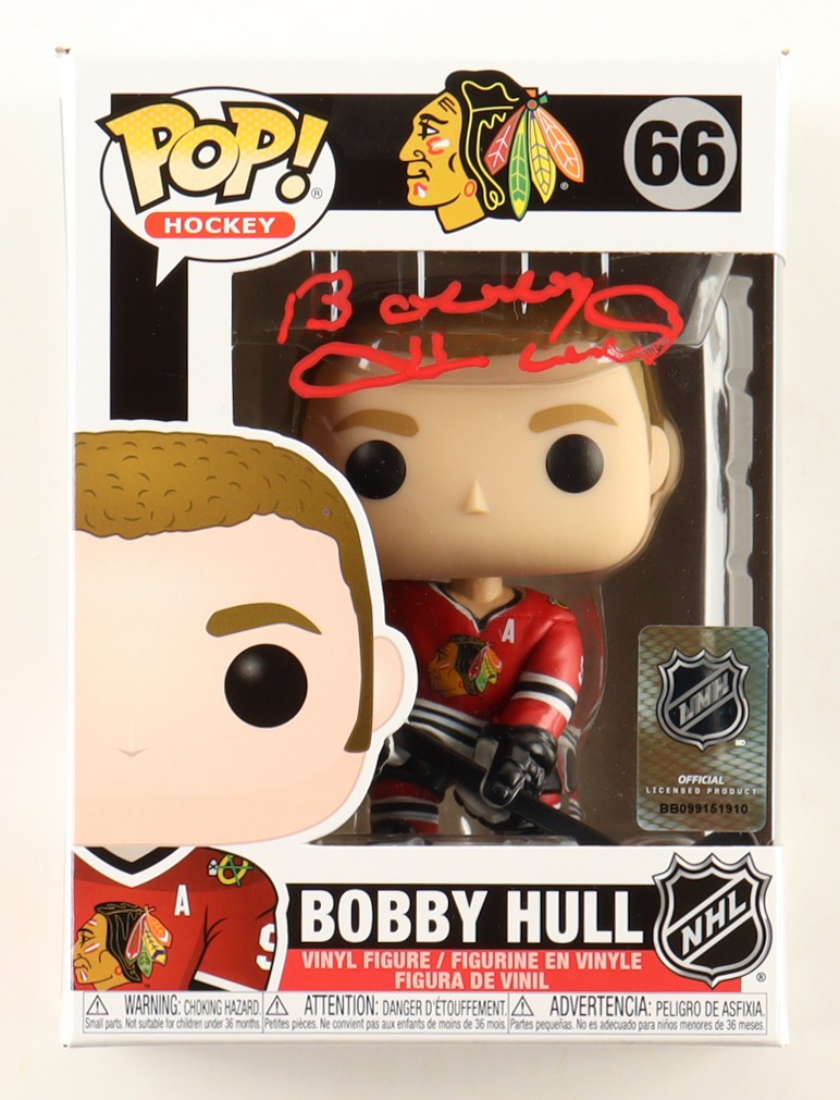 Funko Pop! figure measures approximately 4" tall and the packaging has been hand-signed and inscribed by Bobby Hull (D. 2023, Chicago Blackhawks, HOF). Please note the top left corner is damaged, see photos for more details.